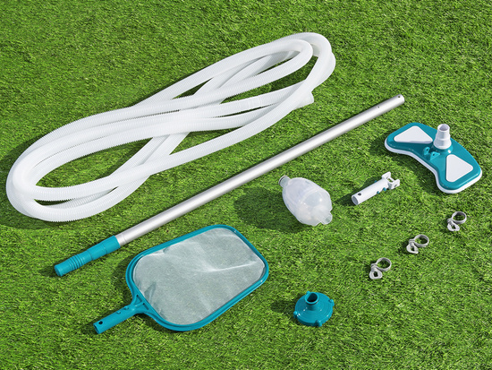 Набір для чистки басейну Bestway 58234 - допоможе вам підтримувати воду чистою, тож ви можете бути впевнені, що ви та ваші діти зможете безпечно подихати та охолодитися у спекотні дні. Цей набір включає алюмінієву телескопічну палицю максимальною довжиною 279 см, тому ви можете легко чистити навіть більші басейни. Основним очисним обладнанням є насадка пилососа, яка при підключенні до фільтруючого насоса збирає бруд у спеціальній камері. Крім того, сітка, що входить у комплект, безсумнівно стане в нагоді для лову більших домішок, що плавають на поверхні води, наприклад комах або листя. Для нормальної роботи пилососа потрібен фільтруючий насос і перехідники, необхідні для підключення.
