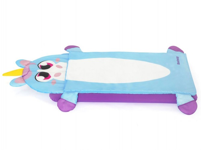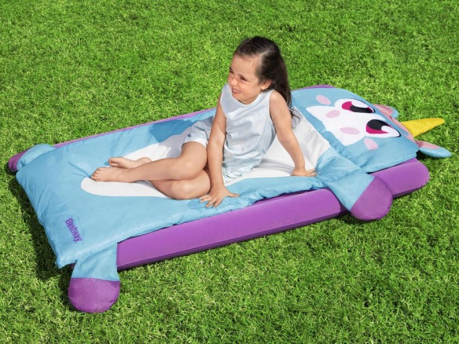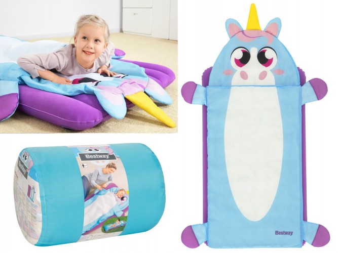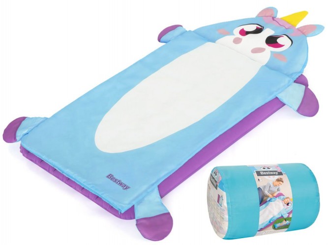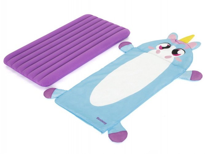 Надувний матрац+спальний мішок Bestway Unicorn 68111 - Надувний велюровий матрац розміром 132 x 76 x 10 см ідеально підходить для використання в приміщенні та на вулиці, наприклад, під наметом. До м'якого ліжечка підійде спальний мішок 158 x 66 см, який укриє дитину під час сну чи сну.