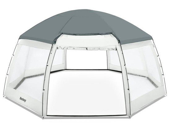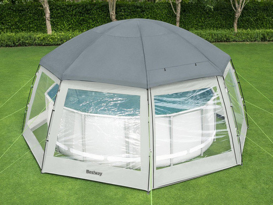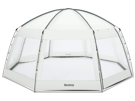 Павільйон для басейну Bestway 58612 - це чудове рішення та ще більший комфорт для використання домашніх садових басейнів. Завдяки використанню надміцних поліефірних матеріалів з полімерним покриттям альтанка стійка до проникнення води. Містка конструкція намету забезпечить комфортну можливість насолодитись купанням у басейні навіть у несприятливу погоду. Залежно від потреб можна розгорнути лише основний купол, який захистить купальщиків від сильного сонячного світла чи дощу. У вітряну погоду або сезонну атаку комарів чи інших комах бокові двері та москітна сітка забезпечать розкіш купання. Важливо й те, що альтанка не дасть воді басейну охолонути. Конструкція альтанки дуже стійка і довговічна. Стійки каркаса виготовлені зі склопластику. Висота конструкції в розкладеному вигляді становить близько 3 метрів, а ширина - 6 метрів, що дозволить вільно користуватися навіть басейном діаметром 4,88 метра. Крім того, не буде перешкодою вставна драбина, що дозволяє легко і безпечно зайти в басейн.