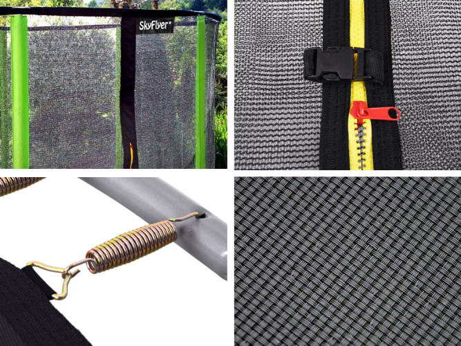 Стовпи сітки кріпляться до батута спеціальними затискачами, що усуває необхідність свердління, яке може ще більше послабити конструкцію та збільшити ризик корозії. Батут SkyFlyer® виготовлено з матеріалів найвищої якості - дуже ретельно перевірено.