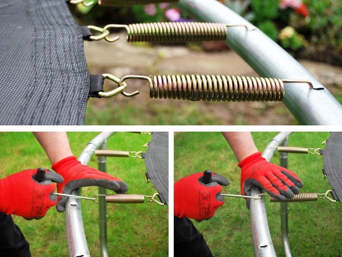 - трубки для сітки кріпляться до ніжок батута за допомогою запобіжних затискачів. Ніжки сітки опущені до землі, що робить всю конструкцію більш жорсткою.