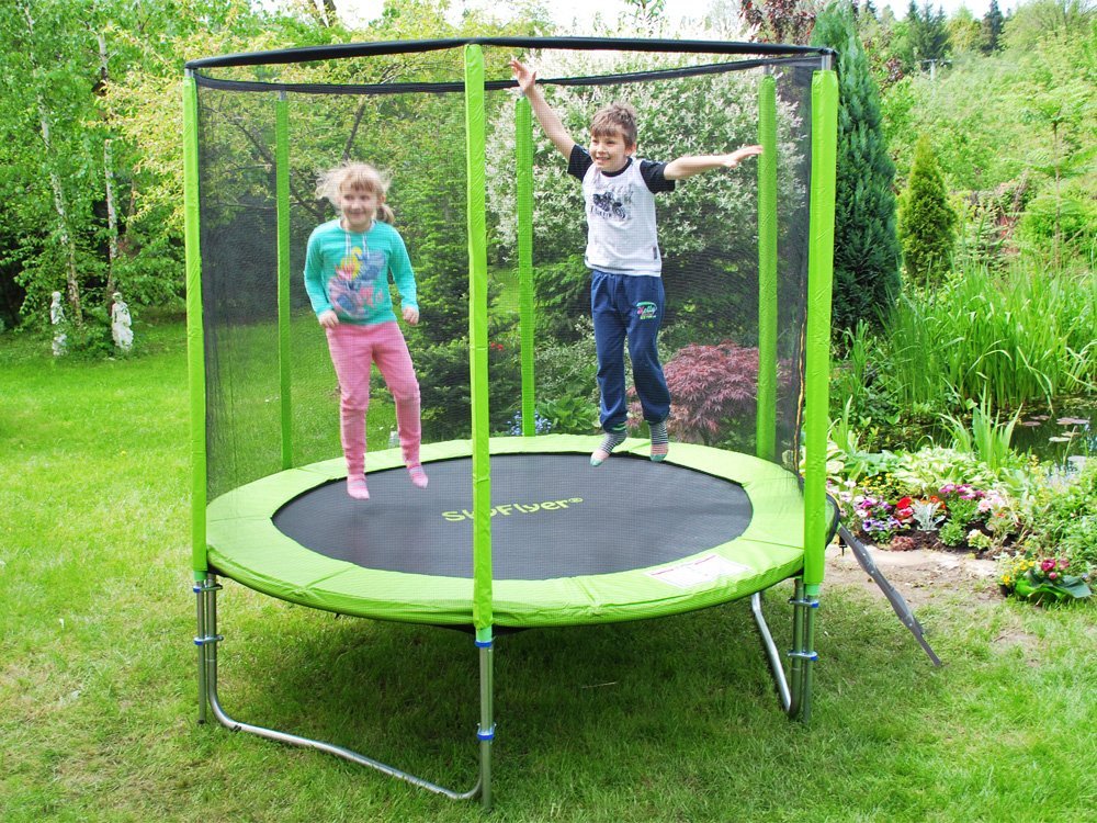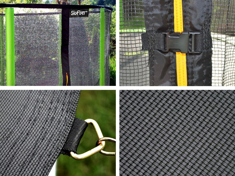 Захисна сітка може бути встановлена двома способами. Таким чином, ви отримуєте батут з внутрішньою сіткою (для маленьких дітей) і зовнішньою сіткою для дітей старшого віку. Матеріал, з якого виготовлений килимок, сітка і пружинний чохол, стійкі до вицвітання і УФ-променів. Завдяки захисту пружин і трубок оцинковкою, структурні компоненти батута надзвичайно стійкі до корозії та несприятливих погодних умов. Стійки сітки кріпляться до батута спеціальними кліпсами, що виключає необхідність свердління, яке могло б додатково послабити конструкцію і підвищити ризик корозії. Батут SkyFlyer виготовлений з матеріалів найвищої якості - ретельно перевірених. Завдяки високоякісному мату з поліпропілену, виготовленому в США, ви зможете насолоджуватися довгими роками використання батута.Довговічність і безпека конструкції садового батута SkyFlyer гарантується сертифікатом якості CE, виданим компанією TÜV, світовим лідером у сфері дотримання стандартів безпеки.