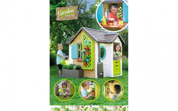 Ігровий Будиночок Garden House Smoby - Якщо ваша дитина активна і цікава, то цей будиночок створений для вашої дитини. Діти із задоволенням стане першокласним садівником і завдяки цьому будиночку він буде відповідальним і матиме свої обов'язки. Зовнішній реалістичний дизайн виконаний у поєднанні імітації цегли та дерева. Його стіни прикрашають 2 вікна зі віконницями, 2 незвичайних круглих вікна та сітка на стіні з підставками для горщиків. Зайти всередину будинку зручно у двері – половинку, в якій є отвір для листів. У середині будиночка ти знайдеш зручний знімний столик з отворами для садових інструментів, керівництво з підказками з висадки квітів і дошку для записів крейдою. Також тут ти знайдеш: великий квітник, 6 горщиків для квітів, садові інструменти, лійка та годівниця для птахів.