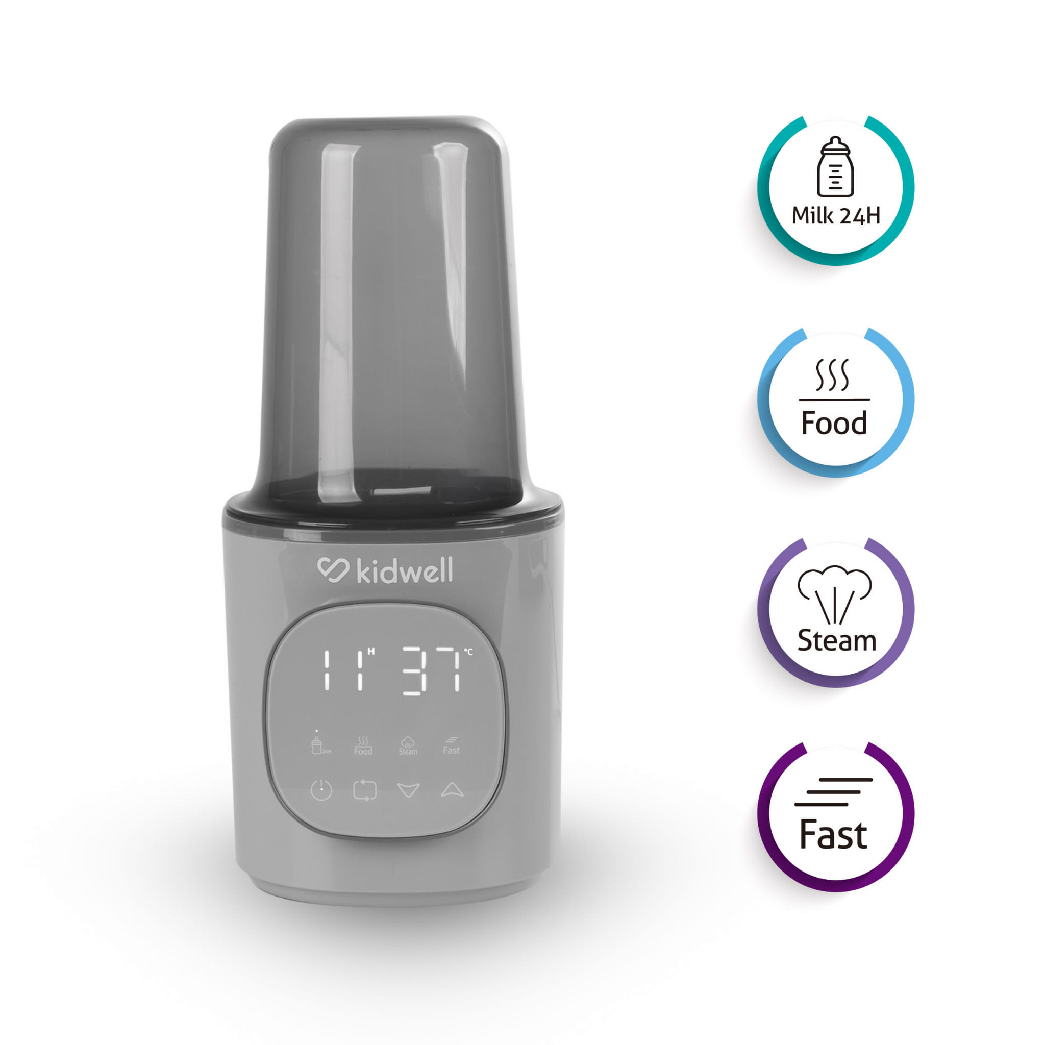 Підігрівач пляшечок Kidwell GALA - універсальний помічник у повсякденному житті кожного з батьків. Він завжди буде готовий до годування, точно підігріваючи молоко або їжу для вашої дитини. Грілка має зручний кошик, розміщений у нагрівальній камері – завдяки йому ви можете легко вийняти нагріту пляшечку або стерилізовані аксесуари. Підігрівач для пляшечок Gala оснащений інтуїтивно зрозумілою сенсорною панеллю керування , що робить його використання дуже простим та зручним. Ви можете легко вибрати режим роботи пристрою та налаштувати його параметри відповідно до своїх потреб. Функція автоматичного відключення у разі нестачі води забезпечує безпечне використання. Підтримка ідеальної температури для молока або страв забезпечується точним термостатом. У режимі 24-годинного МОЛОКА пристрій підтримує температуру 37 ° C – ідеальну температуру для нагрівання молока, захищаючи його від втрати цінної поживної цінності. Чіткий дисплей показує поточну температуру та час роботи, що залишився. Kidwell GALA – це обов'язковий елемент кожного дитячого одягу. Його привабливий та мінімалістичний дизайн доповнить будь-який домашній декор. Він також стане чудовим подарунком на вечірку з нагоди народження дитини, який оцінять батьки.
