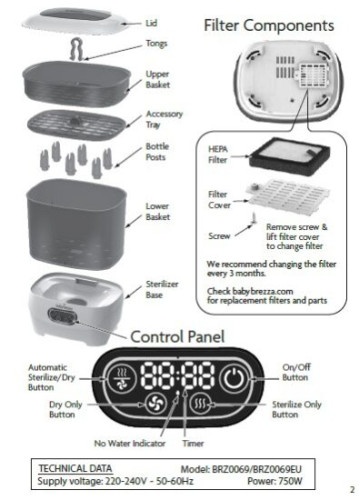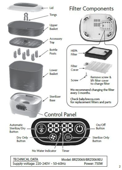 Корисно знати: - Фільтр HEPA слід замінювати кожні 3 місяці, щоб забезпечити оптимальну роботу пристрою. Фільтри HEPA видаляють 95% мікробів і потребують регулярної заміни. - Для досягнення найкращих результатів використовуйте дистильовану воду, щоб запобігти накопиченню мінералів. Водопровідна або джерельна вода також підходить, але може знадобитися частіше чистити плиту. - Steriliser Dryer Advanced кип’ятить воду для утворення пари (100°C) для природної стерилізації дитячих аксесуарів, а потім висушує вміст гарячим повітрям (55°C).