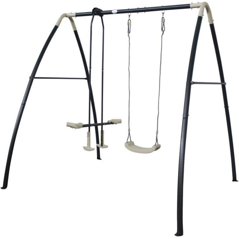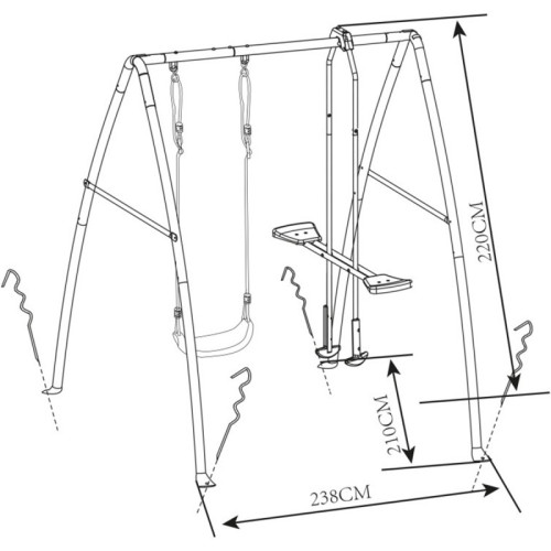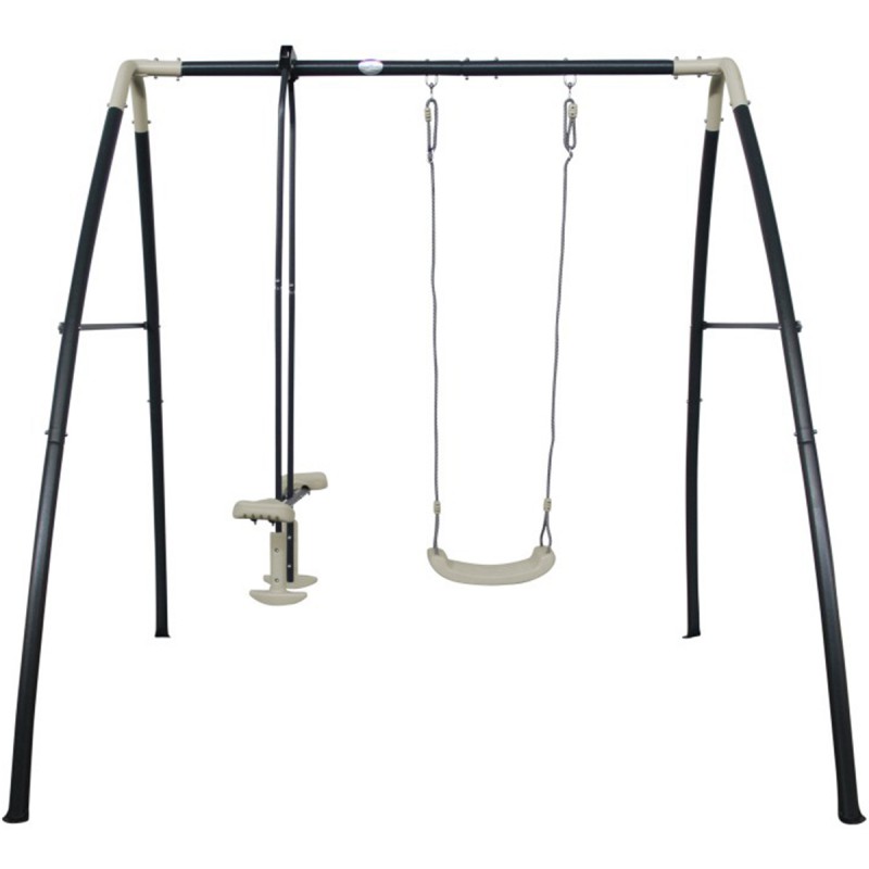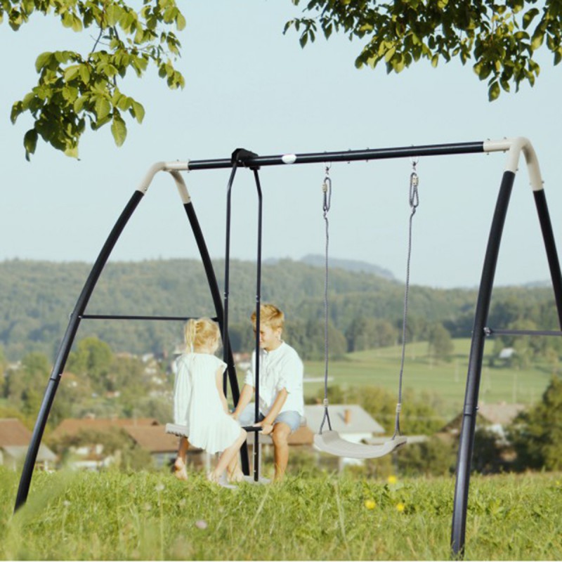 Садова гойдалка AXI з металевим каркасом для дітей А030.245.00 - оснащена одинарними та підвійними качалками, на яких можуть гойдатися одночасно двоє дітей. Сучасний, барвистий каркас є стійким до погодних умов та міцним, а завдяки компактним розмірам також підходить для невеликих садів. З додатковою висотою майже 2,2 метри каркас забезпечує ще більший рух при качанні. Металева качалка виготовлена зі сталі з порошковим покриттям та оцинкована всередині та ззовні. Для додаткової безпеки качалка оснащена чотирма ґрунтовими анкерами, які можна вмонтувати в бетон. Сидіння качелі дуже легко мити, тому ви можете качатися відразу після легкого дощу. Регульовані канати качелі забезпечують тривалий термін служби, оскільки качелі ростуть разом з вами протягом багатьох років.