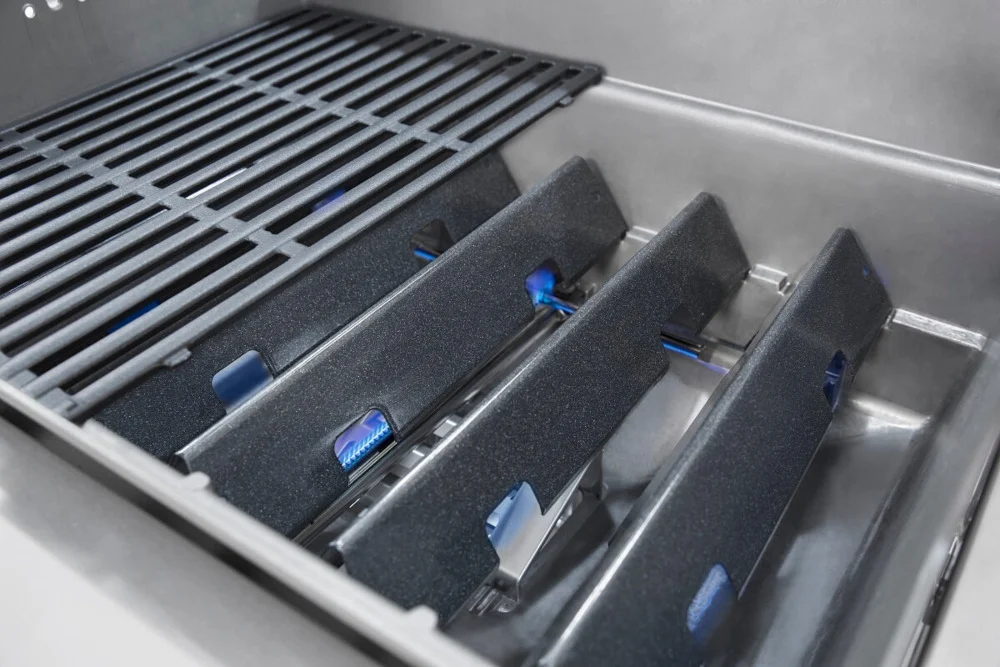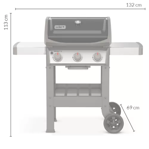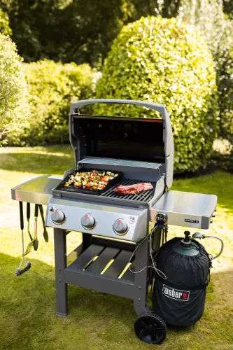 Газовий садовий гриль Spirit II E-310 GBS - Газовий гриль Weber Spirit II E-310 GBS - популярна модель із серії Spirit II від Weber. Гриль оснащений системою гриля GS4, яка включає в себе три високопродуктивні конфорки з нержавіючої сталі, покращені кубики Flavorizer, які покращують смак страв на грилі, і чавунну решітку Gourmet BBQ System. Довговічність гриля підвищує товста алюмінієва конструкція кришки та варильної ємності, які додатково захищені порцеляновим емальованим покриттям. Тумбочки і панель управління виготовлені з високоякісної нержавіючої сталі.Три конфорки мають загальну потужність 8,79 кВт, що забезпечує чудові результати гриля та покривається 10-річною гарантією виробника. Кубики-ароматизатори покриті порцеляновою емаллю і виконують подвійну функцію: вони вловлюють краплі жиру, додаючи смаку стравам. Чавунна решітка для приготування їжі має розміри 60 x 46 см і загальну поверхню для приготування їжі 2760 см2. Він також покритий порцеляновою емаллю для запобігання прилипання їжі. Гриль також оснащений решіткою для розігріву 55,7 x 11,4 см і системою барбекю Gourmet зі змінними аксесуарами, такими як камінь для піци або чавунна сковорода. Гриль легко запалюється завдяки системі Infinity Ignition і має передню панель з інтуїтивно зрозумілим і зручним управлінням. Система глибокого дренажу жиру виготовлена з литого алюмінію та оснащена одноразовими піддонами для крапель для легкого очищення.