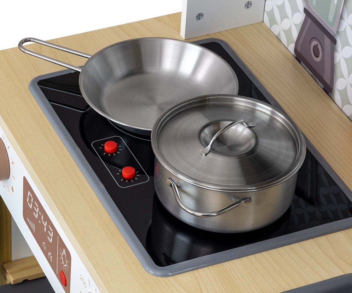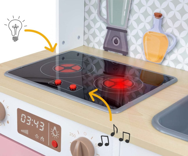 Дерев'яна дитяча кухня Milly Mally Bjorn - – це меблі мрії для маленьких кухарів. Діти наслідують своїх батьків – тому вони хочуть готувати смачні страви для всієї родини, як мама, тато чи бабуся. Дерев'яна кухня Milly Mally Bjorn-Mint оснащена духовкою з відкидними дверцятами та віконцем з плексигласу, деком для випікання, двома ручками-клацаннями та кнопкою червоного світла. Поруч з духовкою знаходиться невеликий холодильник з реалістичною льодогенератором. У дверцятах, що відкриваються, знаходиться прозора чашка з трьома кубиками льоду. На стільниці розташована електрична варильна поверхня з двома зонами приготування та кнопками, які активують звуки киплячої води та підсвічування конфорки. Також є сіра раковина з однією чашею та краном. Витяжка має дві кнопки, які активують звук або світло витяжки, два розсувні гачки та годинник з рухомими стрілками, що висить поруч. Ліворуч на стіні розташовані блендер та скляна пляшка з олією; праворуч – імітація сушарки для посуду з обробною дошкою, тарілками та чашками зверху. Над раковиною розташована мікрохвильова піч з дверцятами, що відкриваються, та прозорим вікном з плексигласу, щоб маленький кухар міг бачити інгредієнти всередині. и Кухня росте разом з вашою дитиною завдяки регульованим ніжкам.