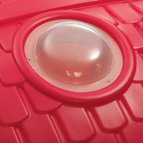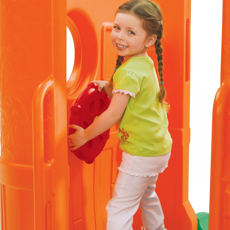 - будиночок має драбину з великими сходинками, поручні для лазіння, кругле віконце, даховий люк, кермо і пологий спуск з гіркою 98 см