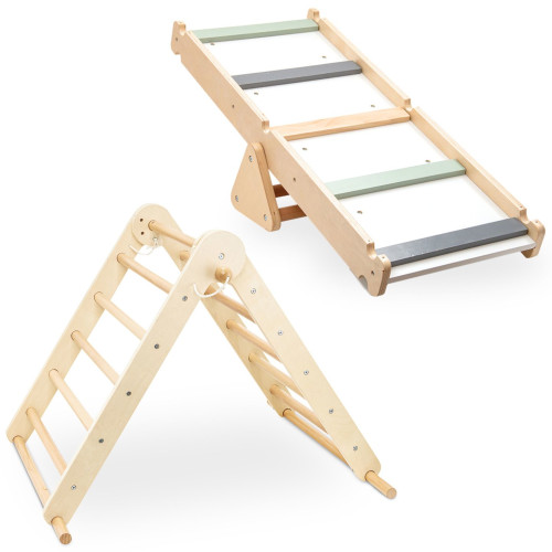- Ігровий майданчик включає моторний трикутник Pikler, невелику трикутну опору та двосторонню дошку з функцією лазіння та сходів.