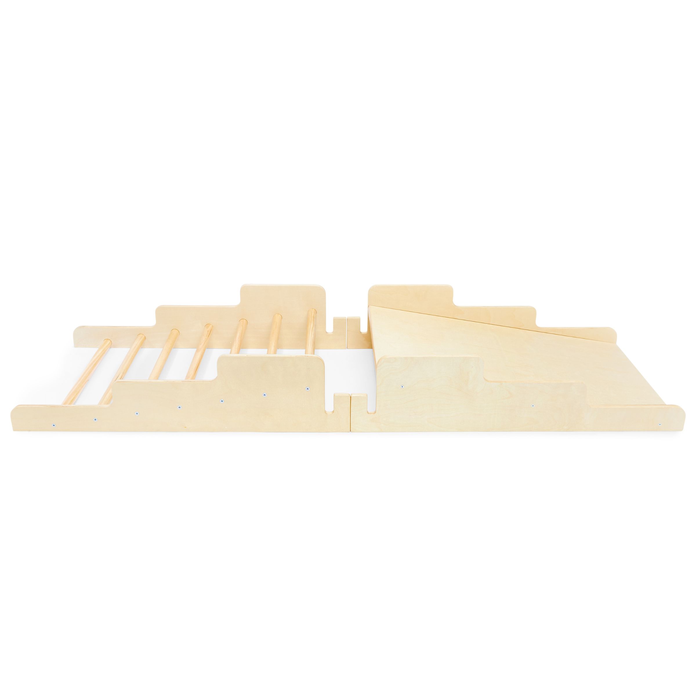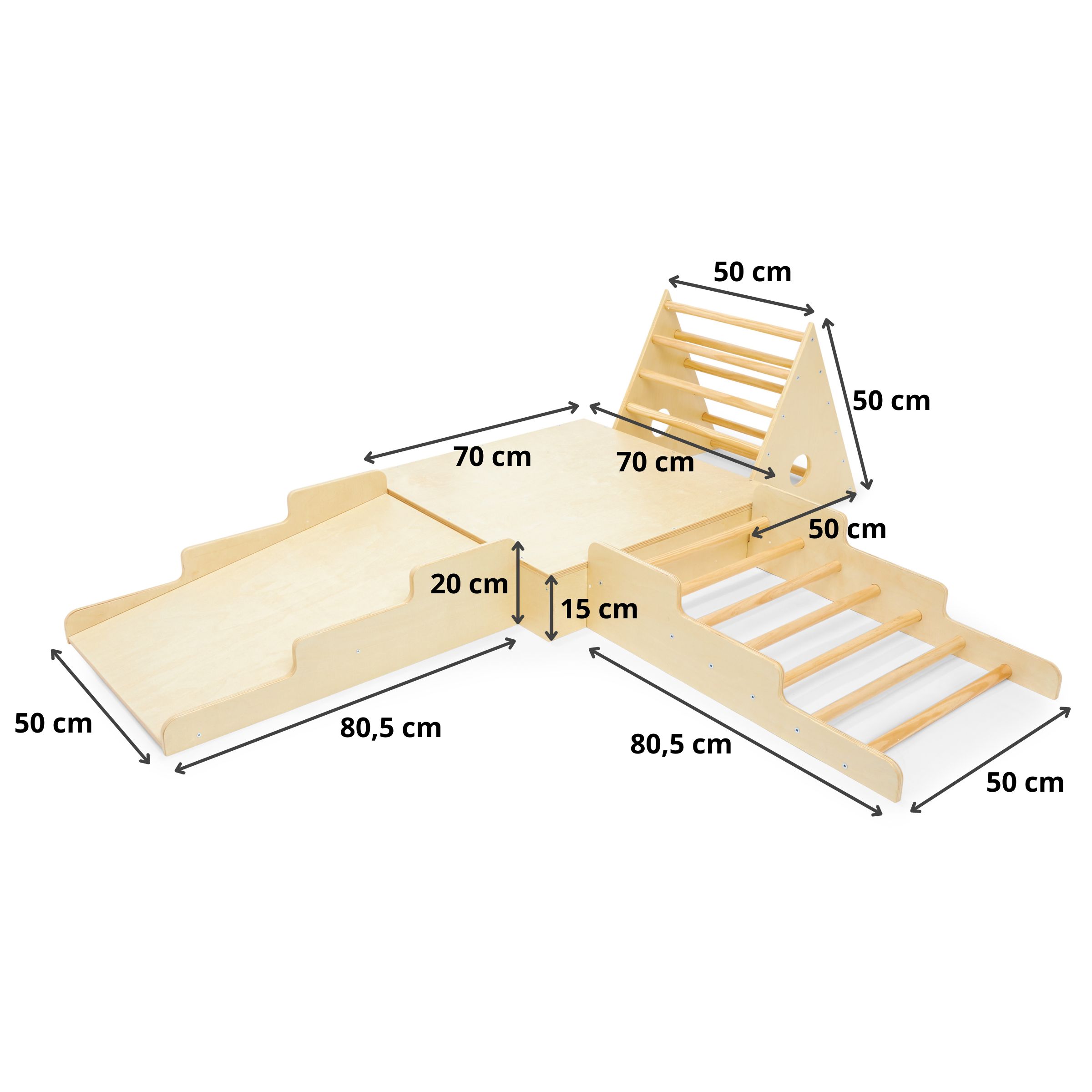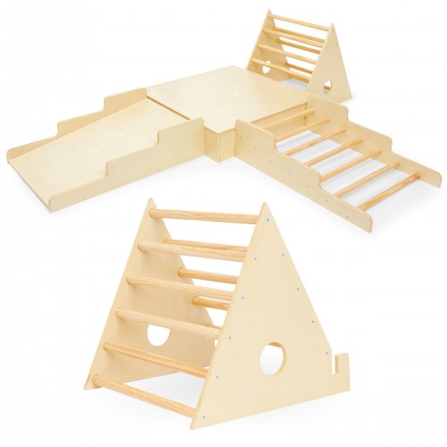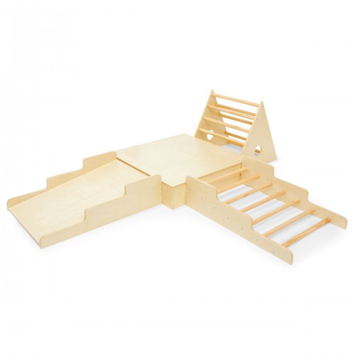 - Ігровий майданчик складається з унікальних елементів, які гарантують найкраще задоволення. Однією з них є драбинка у формі трикутника, висота якої дозволяє маленьким дітям досягати перших висот і радіти новим досягненням. Крім того, на майданчику також є друга плоска лазалка, широка гірка та майданчик. Такі універсальні елементи неодмінно заохотять малюка гратися годинами!