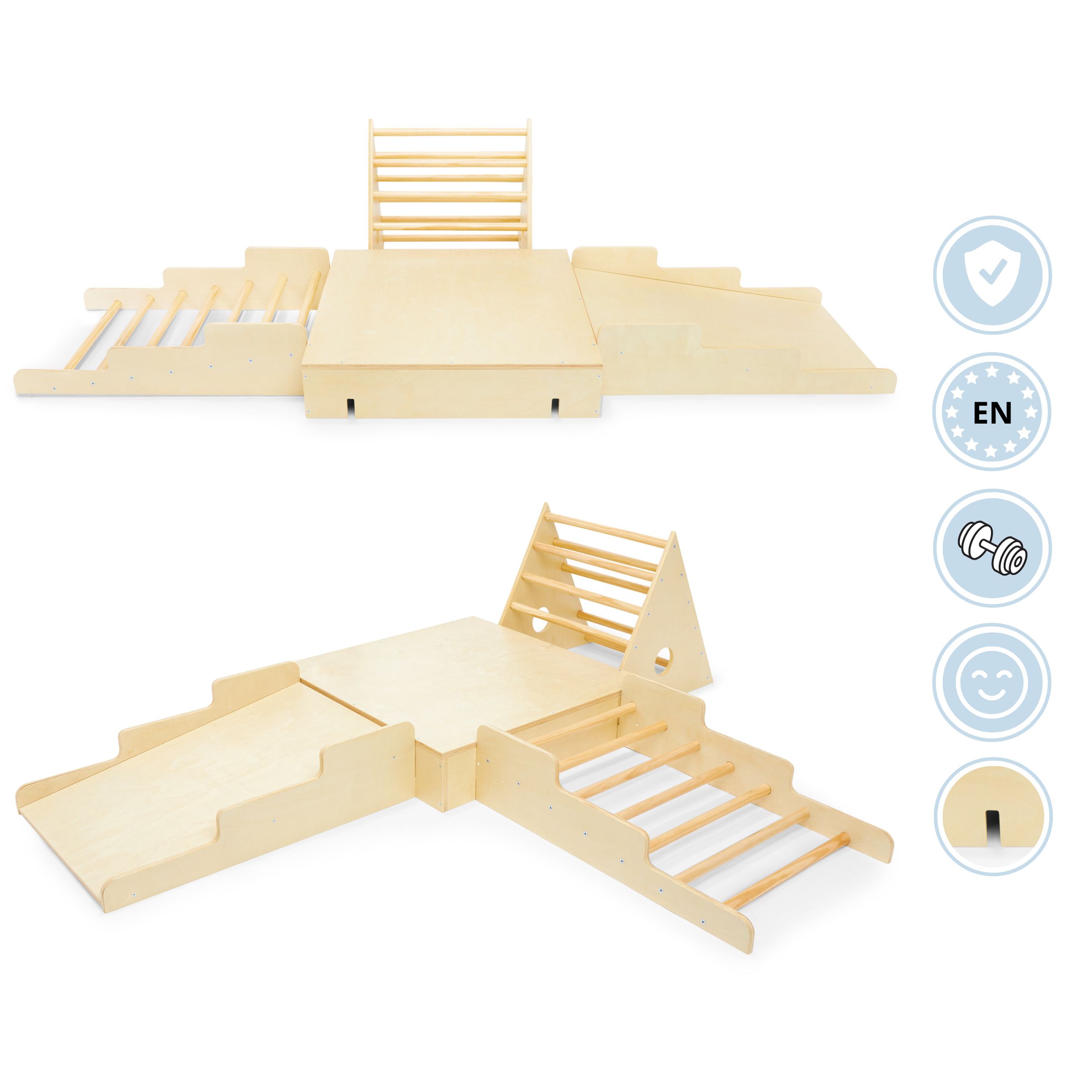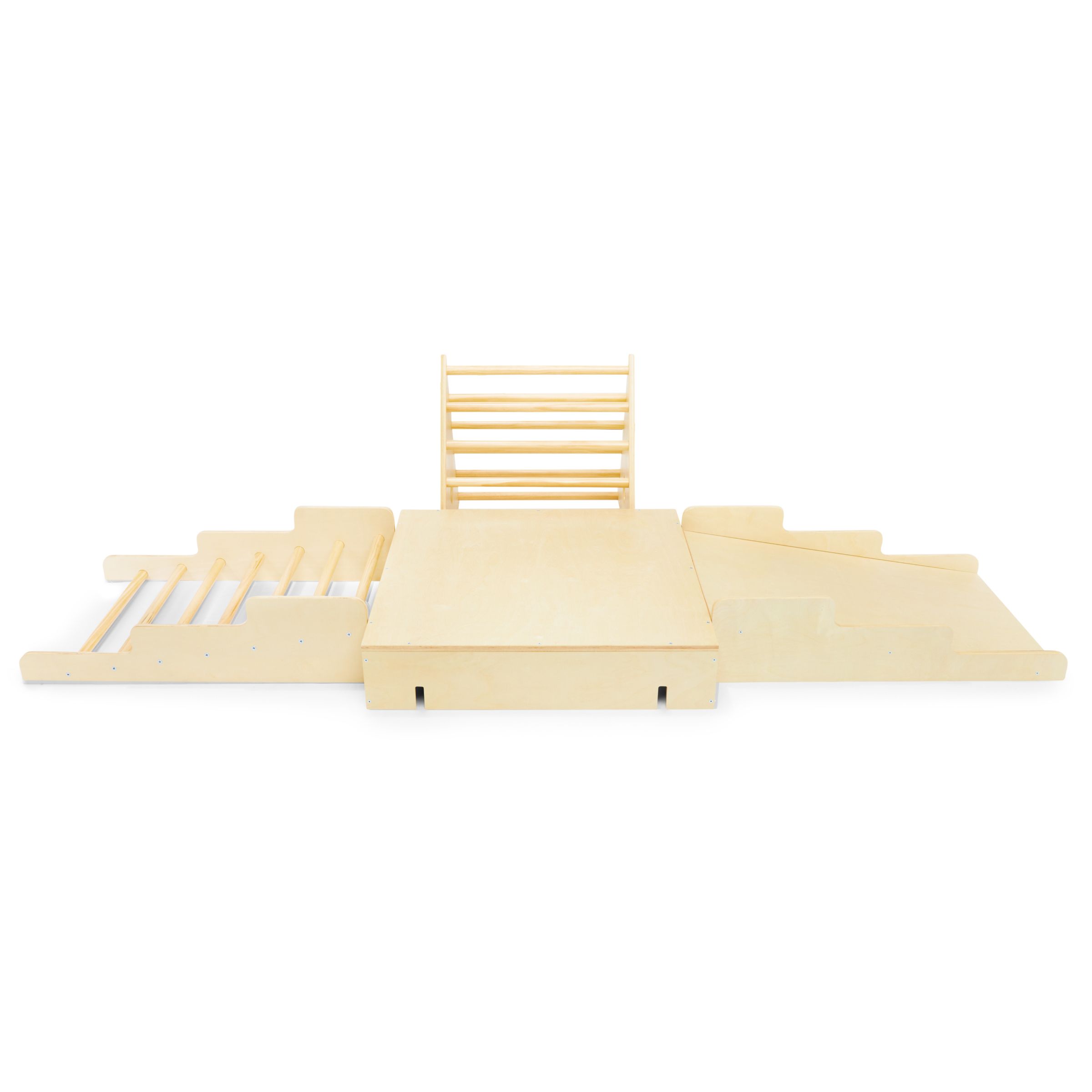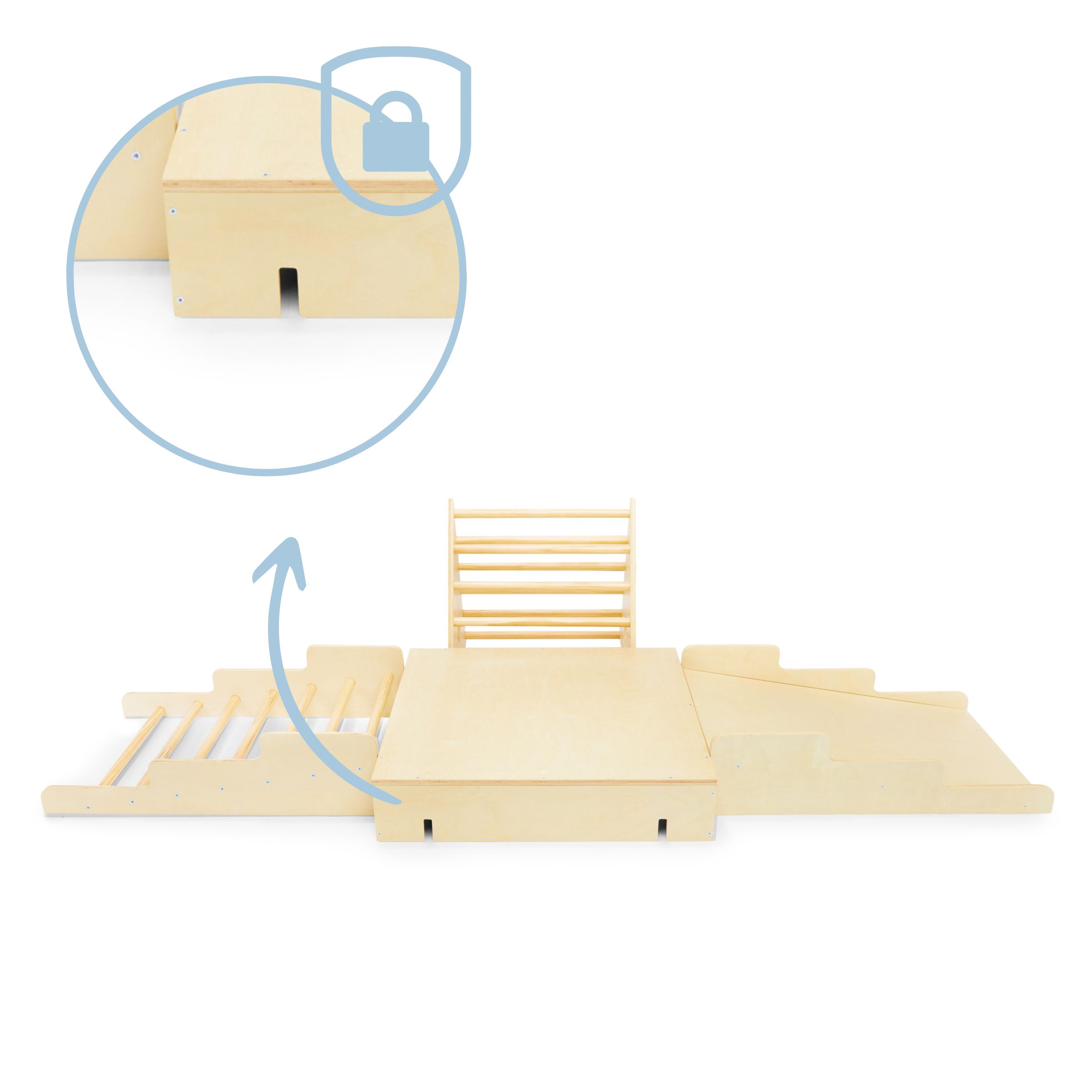 - Ігровий майданчик складається з унікальних елементів, які гарантують найкраще задоволення. Однією з них є драбинка у формі трикутника, висота якої дозволяє маленьким дітям досягати перших висот і радіти новим досягненням. Крім того, на майданчику також є друга плоска лазалка, широка гірка та майданчик. Такі універсальні елементи неодмінно заохотять малюка гратися годинами!