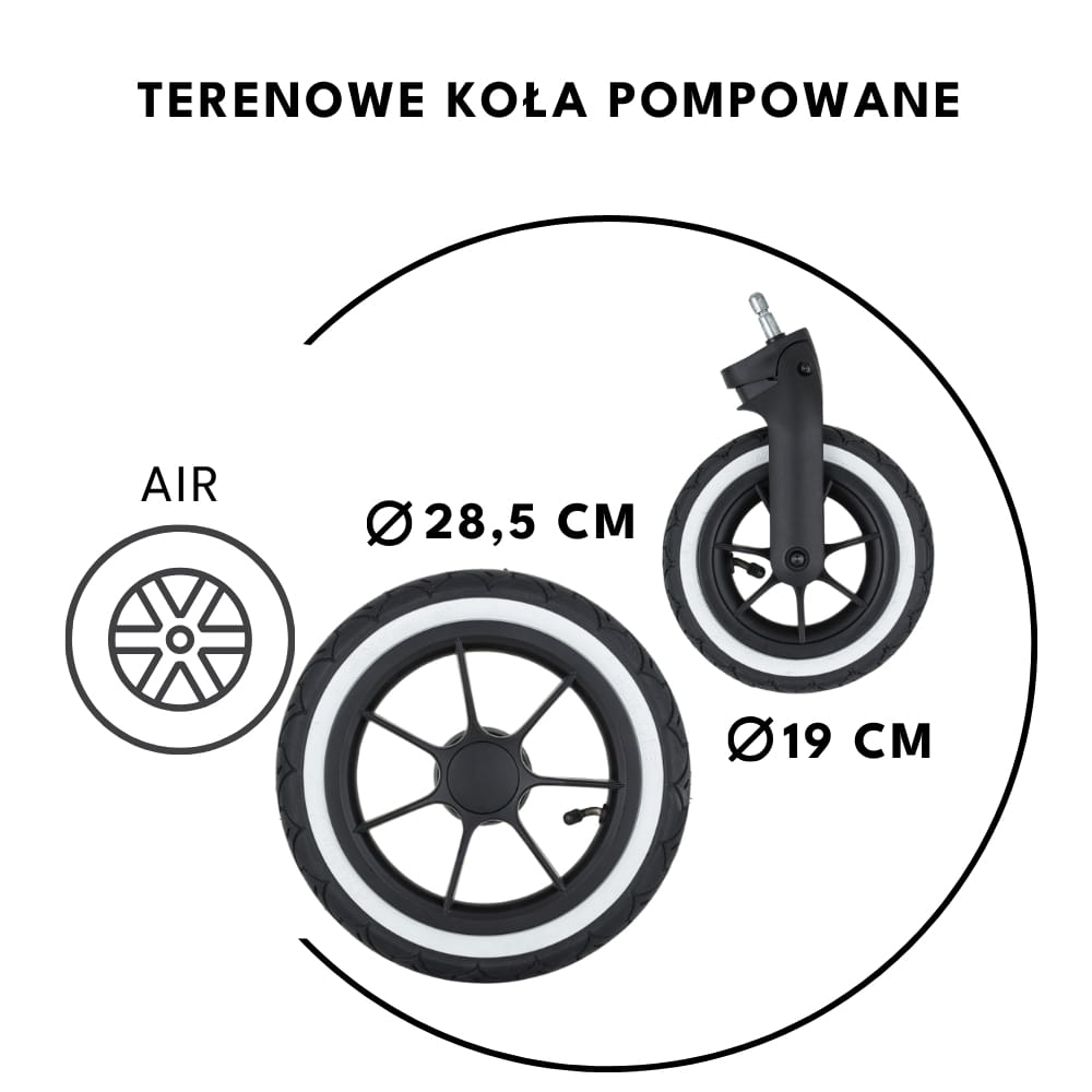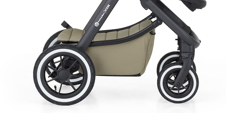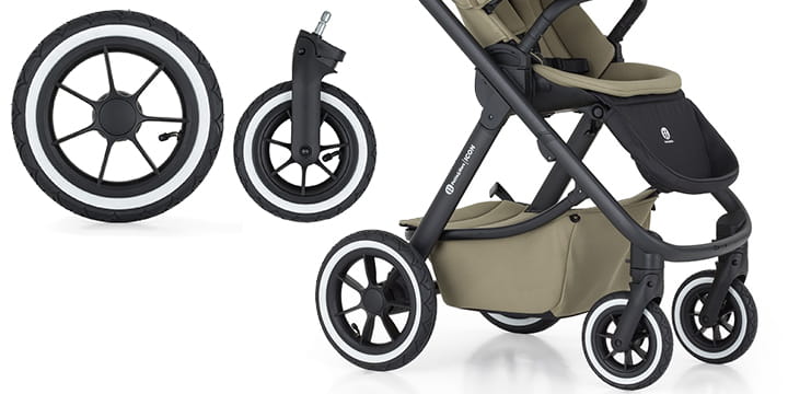 - ICON AIR має великі надувні колеса для плавного ходу та легкої маневреності на різних поверхнях. Передні колеса оснащені механізмом блокування для додаткової безпеки та стійкості на нерівній місцевості.