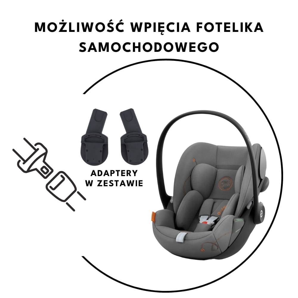 - У комплекті є адаптери, які дозволяють встановити автокрісло багатьох провідних брендів, наприклад, Cybex, Maxi-Cosi, Britax-Romer, Avionaut та багатьох інших. Ви можете створити практичну систему для подорожей і комфортно подорожувати з малюком. Автокрісло не входить до комплекту.
