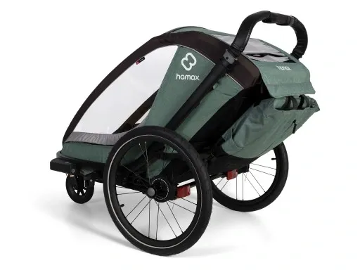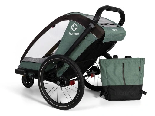 Велосипедний причіп Hamax COCOON ONE- це нові, зручні та безпечні, багатофункціональні причепи для перевезення дітей у пропозиції Hamax. Міцна алюмінієва рама забезпечує оптимальний захист для дітей і багато місця в салоні.Hamax Cocoon можна використовувати як велосипедний причіп або як коляску.Гальмо на кермі - легкодоступне гальмо допоможе знизити швидкість причепа та буде особливо корисним під час ходьби або бігу по похилих пагорбах.Знімні сумки - сумки кріпляться до задньої частини причепа. Вони знімні, тож ви можете брати їх у магазини, кафе тощо – або просто зберігати інші необхідні речі в дорозі.Інтегрований чохол від дощу - Дощовик зберігається в задній кишені, уже прикріплений до причепа за допомогою блискавки, і його можна швидко натягнути на причіп, коли раптово вдарить дощ.Hamax Cocoon має зручний салон і великі вікна, завдяки яким ваша дитина добре оглядається під час руху. Причіп легко складається і транспортується. Підлога кабіни покрита пластиком. Також у причепі є 5-точкові ремені для підвищення безпеки дитини під час руху.