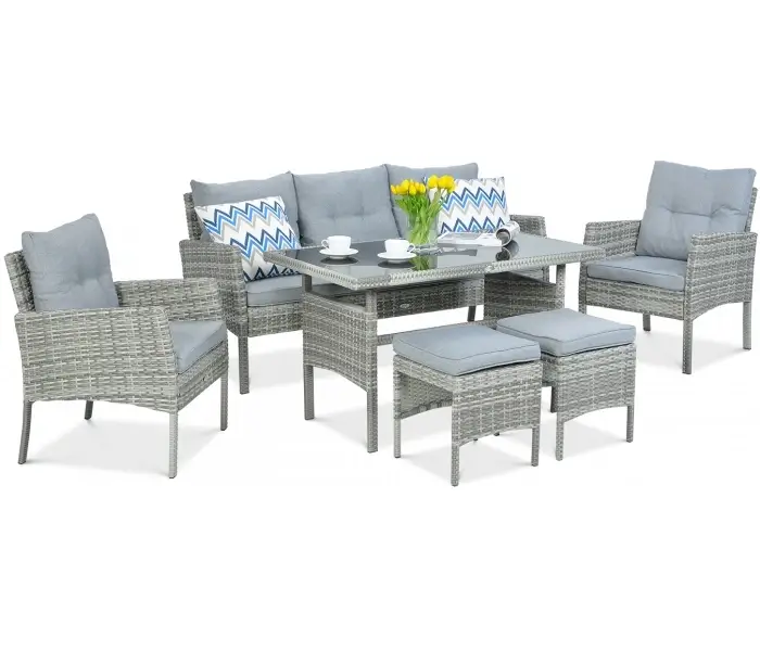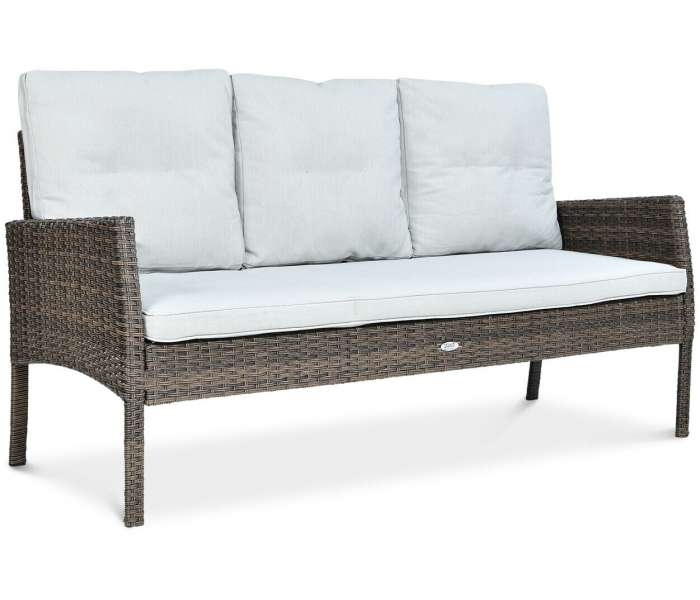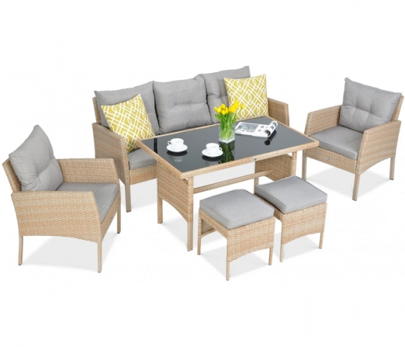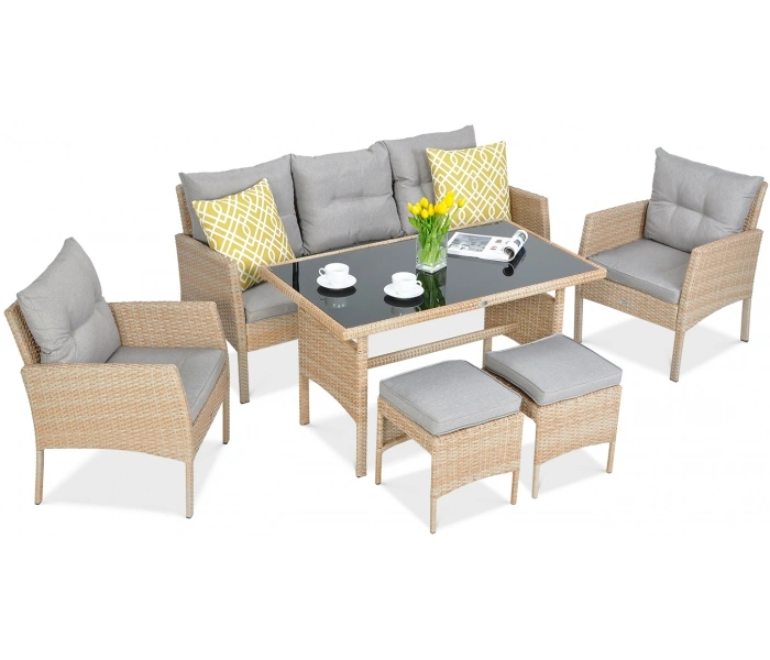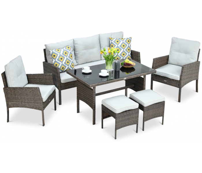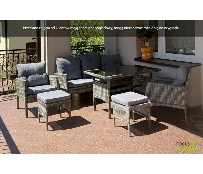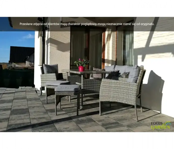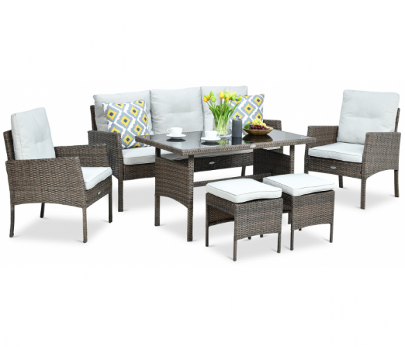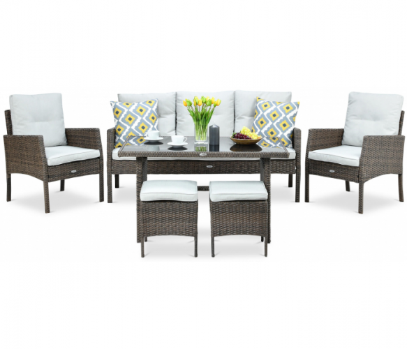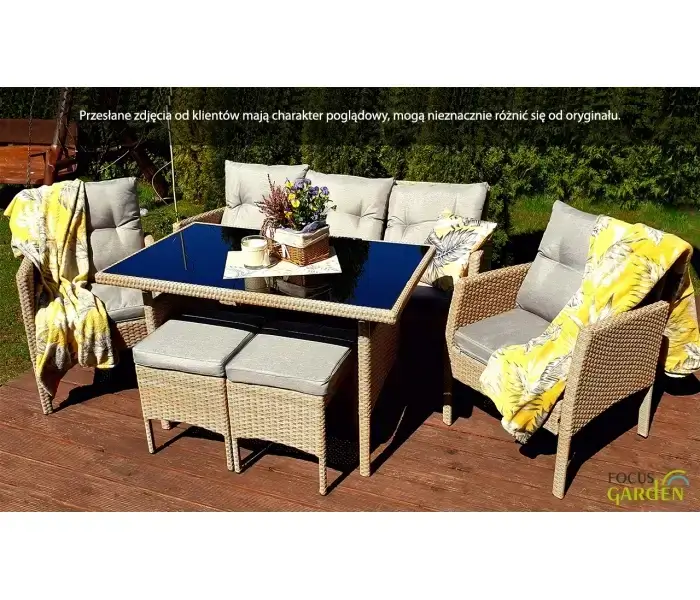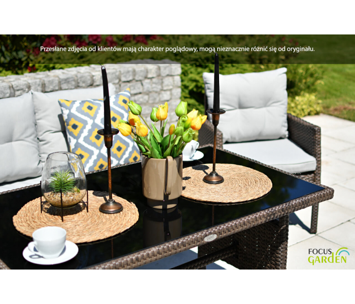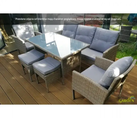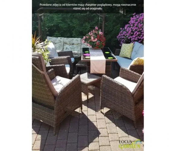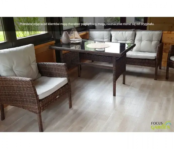 Комплект садових меблів CORTINA - ви точно оціните унікальний комплект з техноротангу CORTINA. Меблі зачарують вас не тільки безкомпромісним комфортом, але й позачасовим дизайном, солідністю та ретельною обробкою. Комплект з техноротангу CORTINA складається з просторого столу, комфортного 3-місного дивана, двох крісел і двох пуфів, які також можна використовувати як зручні підставки для ніг. Набір зі стильної модної коричневої коси стане чудовим доповненням до Вашого саду. Однак естетика цих садових меблів поєднується з їх міцною конструкцією. Вони виготовлені з ще більш товстого, винятково міцного та додатково посиленого плетіння техноротангу, тому розраховані на високі навантаження та бездоганно прослужать вам довгі роки. Цьому матеріалу не зашкодить ні дощ, ні яскраві сонячні промені. Все це підтримується конструкцією з міцної сталі, яка не піддається корозії та гарантує належну стійкість меблів. Стільниця покрита загартованим склом. Скло міцне, легко миється, а його блискуча поверхня додає елегантності всьому набору. На пуфах, кріслах і дивані щільні, подвійно стьобані і приємно м'які подушки на блискавках - тому комплект CORTINA ефектно спокушає вас на солодку лінь! Вибравши садові меблі CORTINA, ви зможете організувати вечірку на свіжому повітрі, барбекю та забезпечити комфорт усім гостям. Це також дозволить вам створити елегантний куточок відпочинку - цей модний набір меблів підходить для садів, оформлених у бохо, сільському, сучасному та японському стилях.