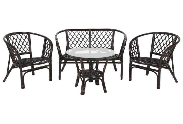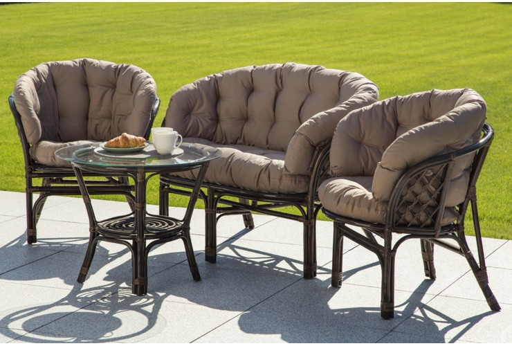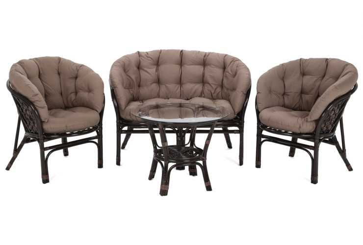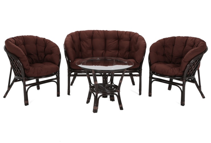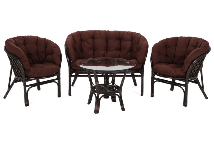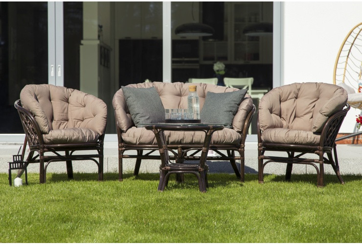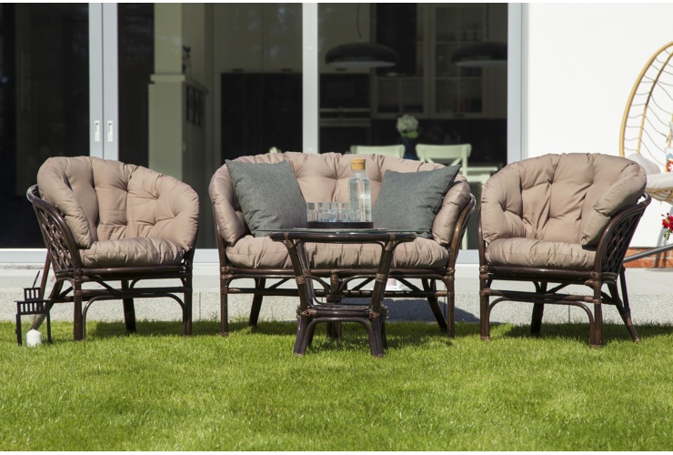 - У комплект входить стіл, 2 крісла, диван, крісло і диванні подушки, скляна стільниця для столу.