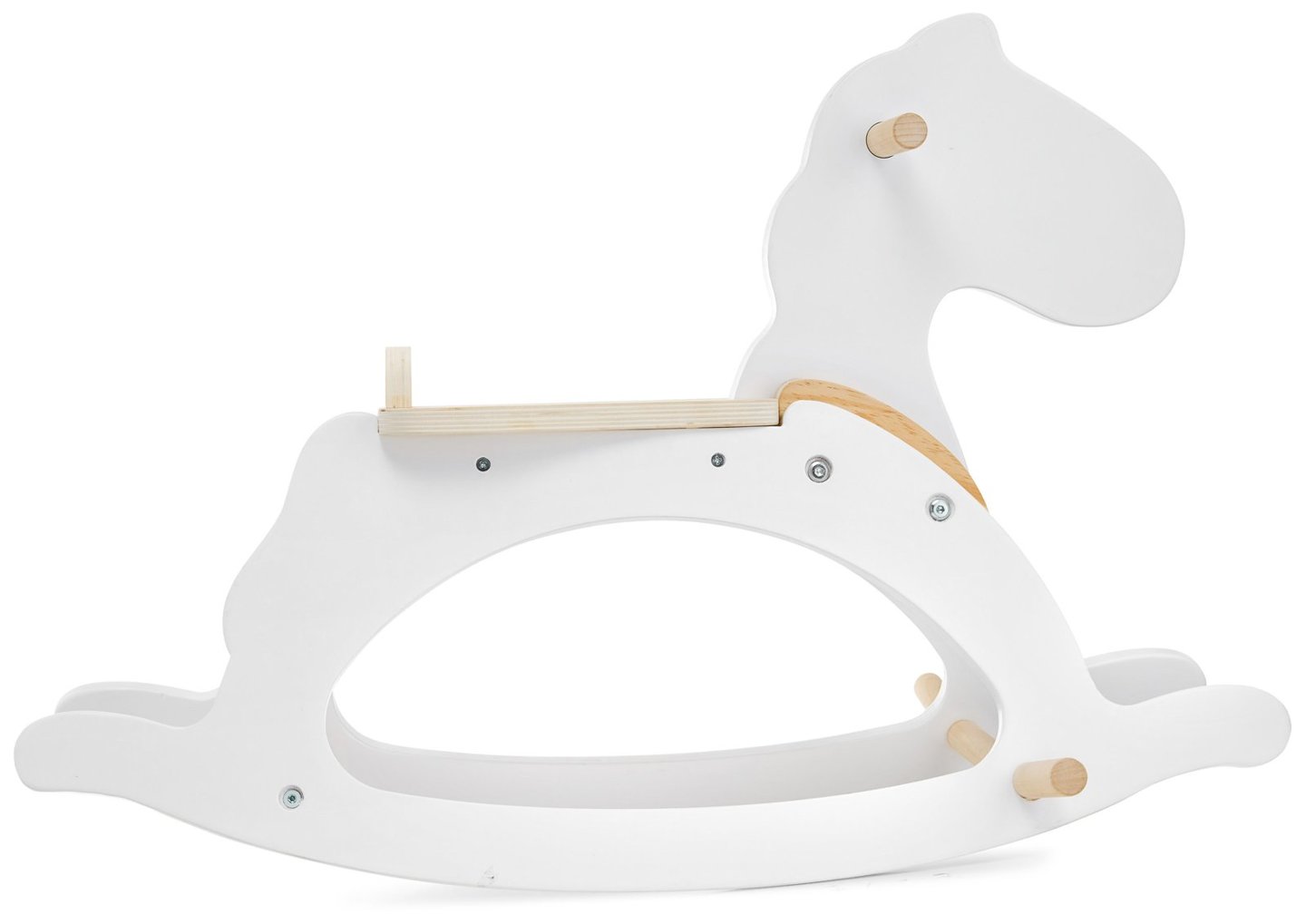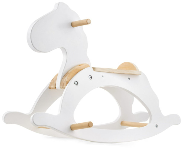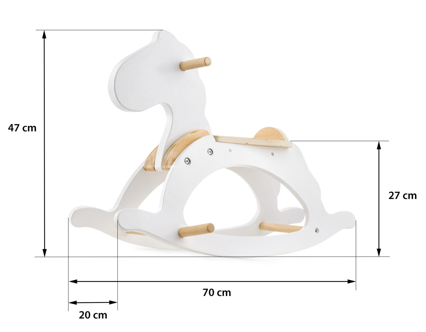Коник-гойдалка Mamabrum - є зіркою серед іграшок і мрією кожної дитини. Класика, яка через роки стає символом дитинства та безтурботних ігор. Наша версія цієї культової іграшки характеризується мінімалістичним дизайном. Універсальне поєднання білого кольору з природним відтінком світлого дерева гарантує ідеальне поєднання з будь-яким типом інтер'єру.Коник безпечний і не перекидається. Сидіння міцне та зручне, з невеликою підтримкою спинки, щоб дитина не могла несподівано зісковзнути з іграшки під час гойдання. Спереду встановлені дерев'яні підставки для ніг, які допомагають легко розгойдувати іграшку і роблять поїздку більш приємною. По обидва боки голови конячки встановлені круглі ручки.Пам'ятайте, що гойдання - це не тільки розвага, але й важлива частина підтримки моторного розвитку дитини, яка таким чином зміцнює м'язи, тренує координацію рухів і почуття рівноваги.