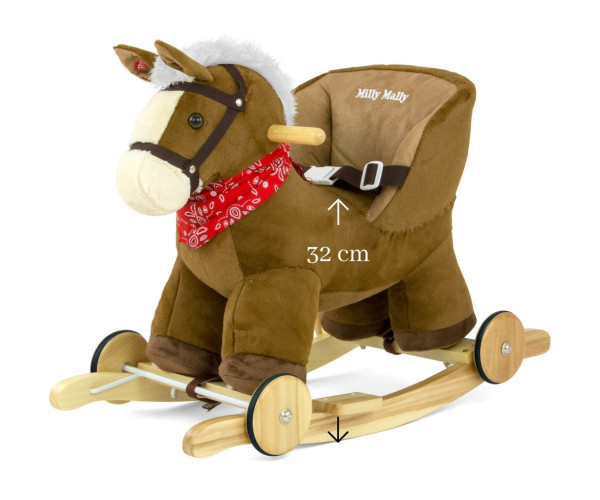 Коник-гойдалка з коліщатками Milly Mally Polly Dark Brown - розроблена для найменших дітей (12 м+), яким традиційні конячки-гойдалки завеликі. Зручне сидіння у формі дивана та регульовані ремені забезпечують комфорт і безпеку під час безтурботного заколисування та переміщення дитини. У коня є дерев'яні жердини з підніжками та ручками, які допоможуть вам утримувати рівновагу під час гри, і набір складних коліс, завдяки яким ви за кілька секунд перетворите його на чудовий плюшевий транспортний засіб. Качалка виготовлена з м'якого і ніжного плюшевого матеріалу . Також є шийна хустка, недоуздок, підніжки на бігунках та інтерактивні вушка. Притиснувши одне вушко, ви почуєте стрибок і іржання коня, а доторкнувшись до іншого, дитина почує веселе іржання коня.