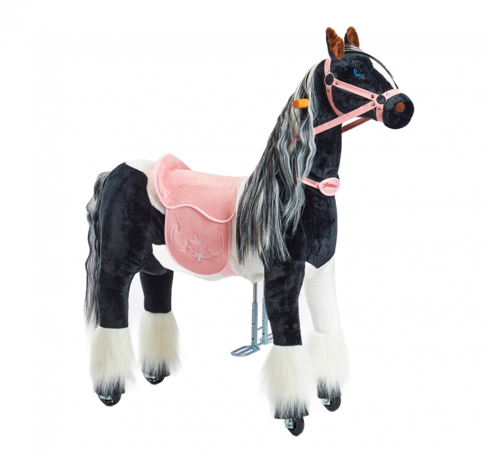 Механічна іграшка коник на колесах Ponnie Domino M з рожевим сідлом - можна привести в рух, регулярно сідаючи і злізаючи з сідла. Вершник обертанням ручок вказує напрямок руху. Кінь приводиться в рух виключно рухом дитини. У нього немає двигуна, тому для переміщення не потрібні батареї. Катання на конях Понні розвиває координацію та рівновагу дитини . Під час їзди дитина задіює важливі групи м'язів, які зазвичай не навантажені, завдяки чому кінь підтримує здоровий розвиток дитини.Конячка (має колеса з безбарвної гуми (чорний зовнішній вигляд надає внутрішнє чорне пластикове посилення коліс), тому вона не подряпає та не забруднить паркет або плаваючу підлогу. На відкритому повітрі тверда рівна поверхня, наприклад асфальт або тротуару, ідеально підходить для їзди. Мають сучасний механізм, який робить їзду плавною та плавною. Він розроблений таким чином, що сідло не виступає з тіла коня і, отже, не порушує його зовнішній вигляд, як у випадку з багатьма іншими подібними продуктами. Крім того, його корпус значно більший, тому діти можуть користуватися ним довше. Додатковою перевагою є можливість зняти сідло, тому ви можете осідлати Понні як справжнього коня. Розчесана грива і хвіст дозволяють заплітати косу.