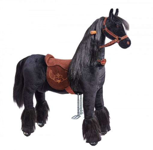 Механічна іграшка коник на колесах Ponnie Ebony M- можна привести в рух, регулярно сідаючи і злізаючи з сідла. Вершник обертанням ручок вказує напрямок руху. Кінь приводиться в рух виключно рухом дитини. У нього немає двигуна, тому для переміщення не потрібні батареї. Катання на конях Понні розвиває координацію та рівновагу дитини . Під час їзди дитина задіює важливі групи м'язів, які зазвичай не навантажені, завдяки чому кінь підтримує здоровий розвиток дитини.Конячка (має колеса з безбарвної гуми (чорний зовнішній вигляд надає внутрішнє чорне пластикове посилення коліс), тому вона не подряпає та не забруднить паркет або плаваючу підлогу. На відкритому повітрі тверда рівна поверхня, наприклад асфальт або тротуару, ідеально підходить для їзди. Мають сучасний механізм, який робить їзду плавною та плавною. Він розроблений таким чином, що сідло не виступає з тіла коня і, отже, не порушує його зовнішній вигляд, як у випадку з багатьма іншими подібними продуктами. Крім того, його корпус значно більший, тому діти можуть користуватися ним довше. Додатковою перевагою є можливість зняти сідло, тому ви можете осідлати Понні як справжнього коня. Розчесана грива і хвіст дозволяють заплітати косу.