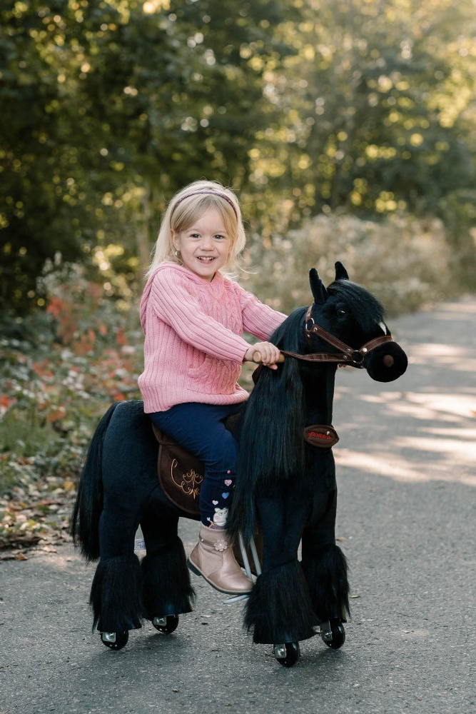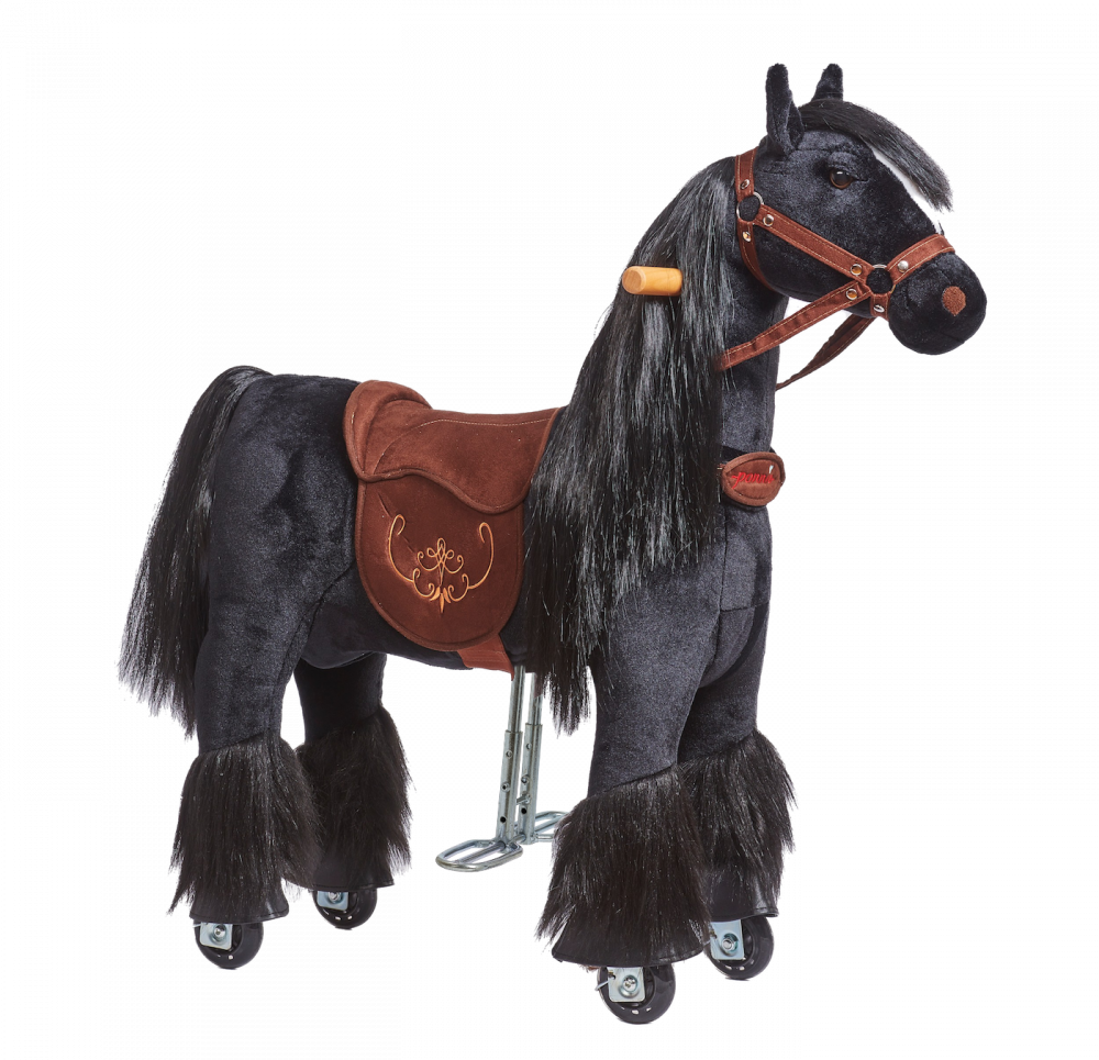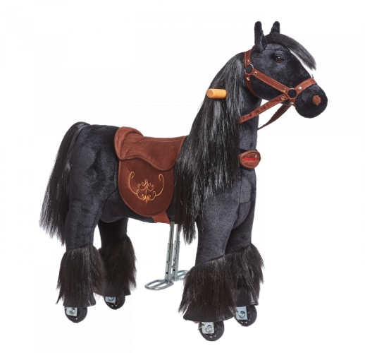 Механічна іграшка коник на колесах Ponnie Ebony S - можна привести в рух, регулярно сідаючи і злізаючи з сідла. Вершник обертанням ручок вказує напрямок руху. Кінь приводиться в рух виключно рухом дитини. У нього немає двигуна, тому для переміщення не потрібні батареї. Катання на конях Понні розвиває координацію та рівновагу дитини . Під час їзди дитина задіює важливі групи м'язів, які зазвичай не навантажені, завдяки чому кінь підтримує здоровий розвиток дитини.Конячка (має колеса з безбарвної гуми (чорний зовнішній вигляд надає внутрішнє чорне пластикове посилення коліс), тому вона не подряпає та не забруднить паркет або плаваючу підлогу. На відкритому повітрі тверда рівна поверхня, наприклад асфальт або тротуару, ідеально підходить для їзди. Мають сучасний механізм, який робить їзду плавною та плавною. Він розроблений таким чином, що сідло не виступає з тіла коня і, отже, не порушує його зовнішній вигляд, як у випадку з багатьма іншими подібними продуктами. Крім того, його корпус значно більший, тому діти можуть користуватися ним довше. Додатковою перевагою є можливість зняти сідло, тому ви можете осідлати Понні як справжнього коня. Розчесана грива і хвіст дозволяють заплітати косу.