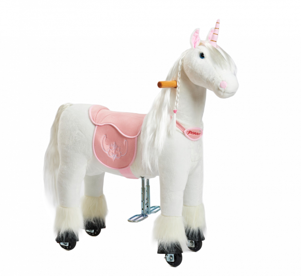 Механічна іграшка коник на колесах Ponnie Merlin S з рожевим сідлом - можна привести в рух, регулярно сідаючи і злізаючи з сідла. Вершник обертанням ручок вказує напрямок руху. Кінь приводиться в рух виключно рухом дитини. У нього немає двигуна, тому для переміщення не потрібні батареї. Катання на конях Понні розвиває координацію та рівновагу дитини . Під час їзди дитина задіює важливі групи м'язів, які зазвичай не навантажені, завдяки чому кінь підтримує здоровий розвиток дитини.Конячка (має колеса з безбарвної гуми (чорний зовнішній вигляд надає внутрішнє чорне пластикове посилення коліс), тому вона не подряпає та не забруднить паркет або плаваючу підлогу. На відкритому повітрі тверда рівна поверхня, наприклад асфальт або тротуару, ідеально підходить для їзди. Мають сучасний механізм, який робить їзду плавною та плавною. Він розроблений таким чином, що сідло не виступає з тіла коня і, отже, не порушує його зовнішній вигляд, як у випадку з багатьма іншими подібними продуктами. Крім того, його корпус значно більший, тому діти можуть користуватися ним довше. Додатковою перевагою є можливість зняти сідло, тому ви можете осідлати Понні як справжнього коня. Розчесана грива і хвіст дозволяють заплітати косу.