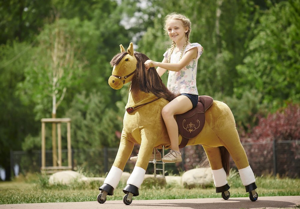 Механічна іграшка коник на колесах Ponnie XL PROFI - можна привести в рух, регулярно сідаючи і злізаючи з сідла. Вершник обертанням ручок вказує напрямок руху. Кінь приводиться в рух виключно рухом дитини. У нього немає двигуна, тому для переміщення не потрібні батареї. Катання на конях Понні розвиває координацію та рівновагу дитини . Під час їзди дитина задіює важливі групи м'язів, які зазвичай не навантажені, завдяки чому кінь підтримує здоровий розвиток дитини.Конячка (має колеса з безбарвної гуми (чорний зовнішній вигляд надає внутрішнє чорне пластикове посилення коліс), тому вона не подряпає та не забруднить паркет або плаваючу підлогу. На відкритому повітрі тверда рівна поверхня, наприклад асфальт або тротуару, ідеально підходить для їзди. Мають сучасний механізм, який робить їзду плавною та плавною. Він розроблений таким чином, що сідло не виступає з тіла коня і, отже, не порушує його зовнішній вигляд, як у випадку з багатьма іншими подібними продуктами. Крім того, його корпус значно більший, тому діти можуть користуватися ним довше. Додатковою перевагою є можливість зняти сідло, тому ви можете осідлати Понні як справжнього коня. Розчесана грива і хвіст дозволяють заплітати косу.