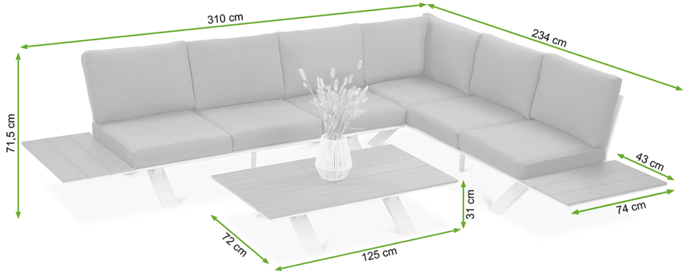 - весь кут: довжина - 310 см, ширина - 234 см, висота - 71,5 см