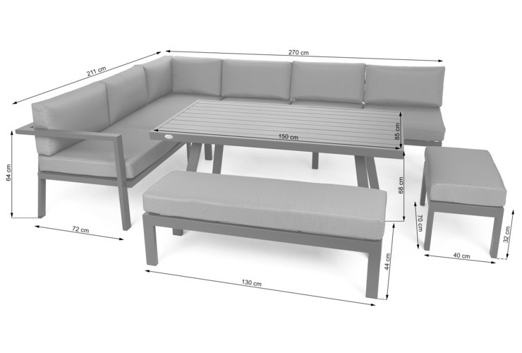 - Висота сидіння всіх сегментів: 32 см / 44 см (з подушками)