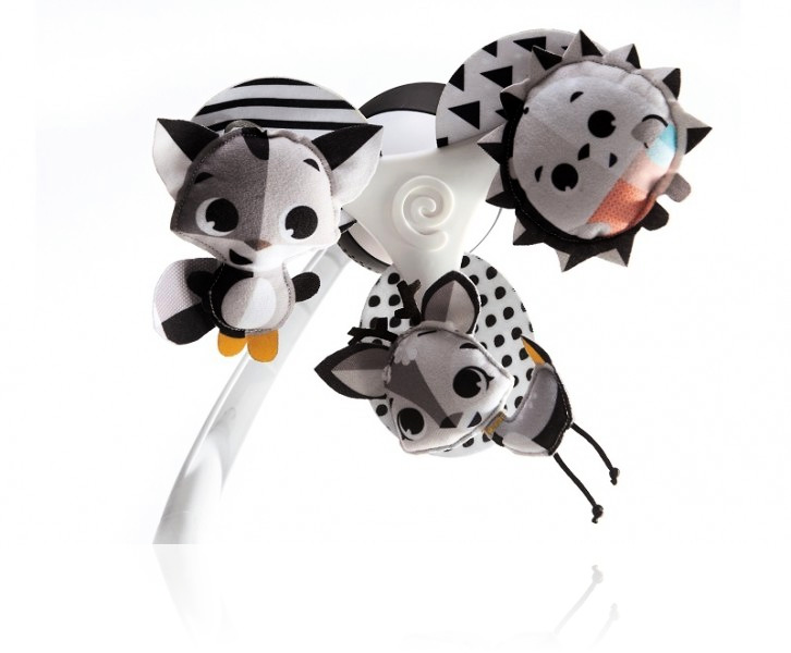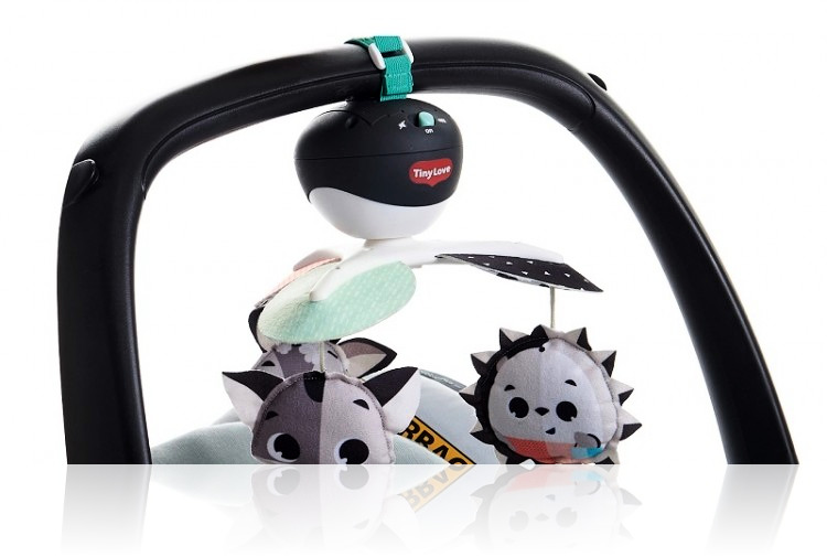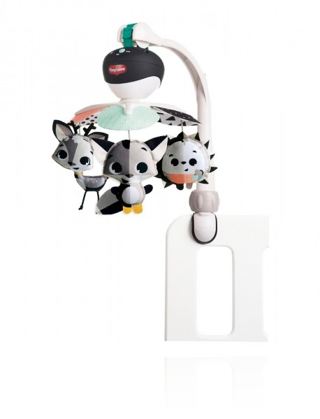 Мобіль Tiny Love Нічний лужок - легкий і музичний, з неймовірними героями, завдяки своїй компактності дозволить взяти веселощі в дорогу. Використовує контрастні чорні та білі кольори, щоб стимулювати зір дитини від народження