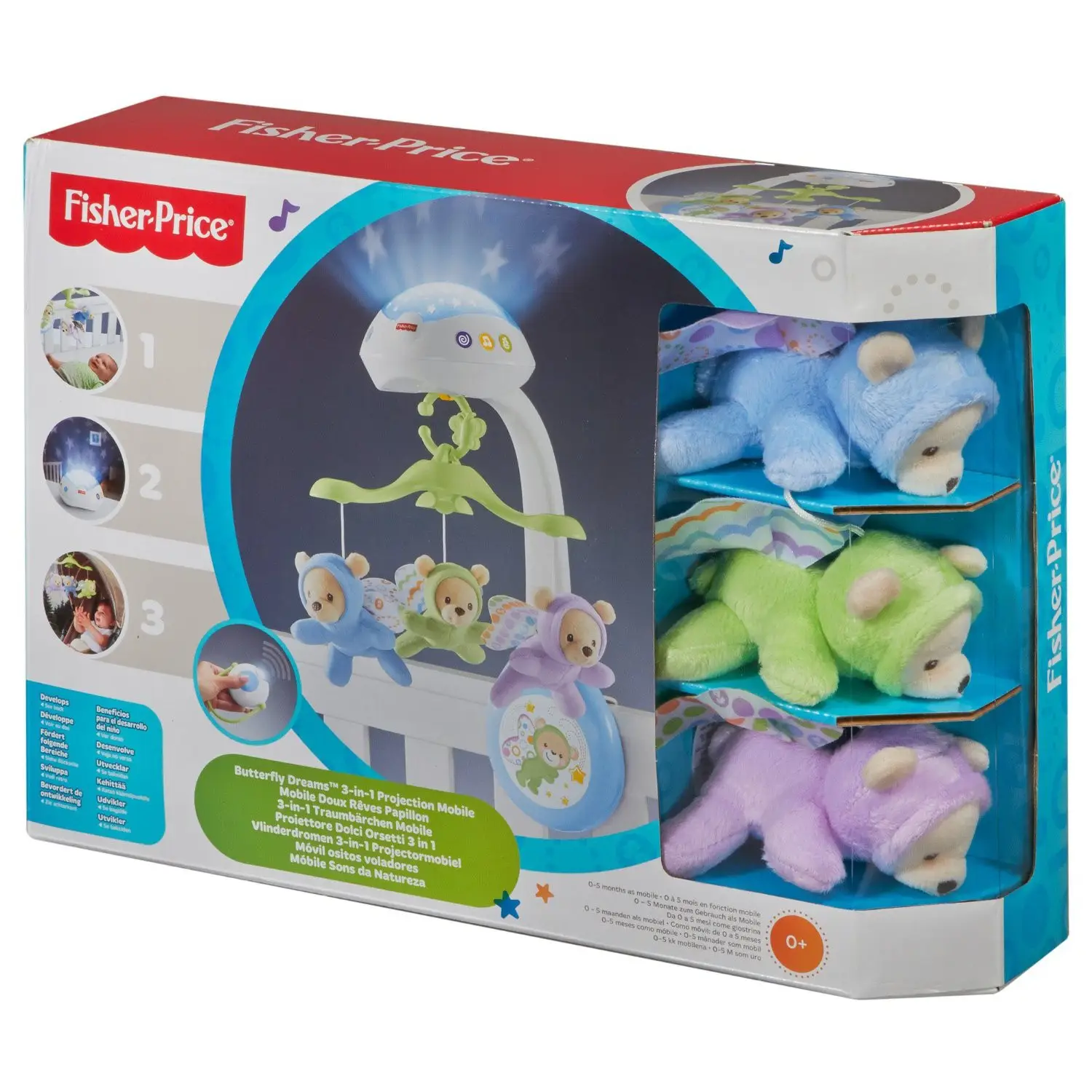 Мобіль-проектор Fisher-Price 3в1 "Сон метелика" - ляє собою багатофункціональний пристрій 3 в 1, який може не тільки розважити малюка або, заспокоївши його, допомогти заснути, але й посприяє концентрації уваги крихти, а також навчить переключати увагу з ближніх об'єктів на віддалені і навпаки! Підходить для дітей від народження. Основу конструкції мобіля "Сон метелика" Фішер-Прайс становить вигнута опора, забезпечена універсальним кріпленням, міцно тримається як на бортику ліжечка, так і на навісі дитячої коляски. Мобіль увінчується проектором, який перетворює стелю і стіни дитячої кімнати в чарівне зоряне небо! До розташованому під проектором тріподу підвішені три казкових ведмежати з крилами метеликів, одягнені в м'які піжамки ніжних квітів. Їх неспішне кружляння допоможе малюку розслабитися і зануритися в світ солодких снів. Для повноцінного впливу мобіль "Сон метелика" Fisher-Price обладнаний системою відтворення звуків. У його "репертуарі" три варіанти мелодій: колискові, звуки природи або приємний білий шум.