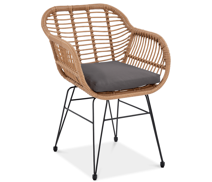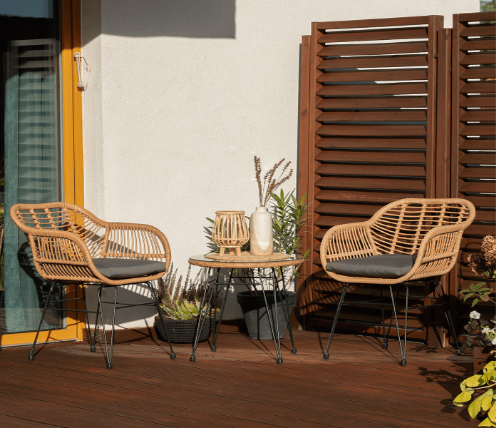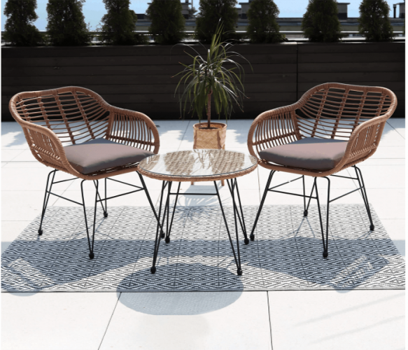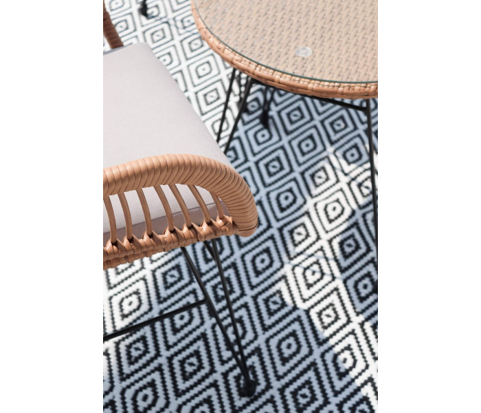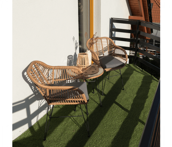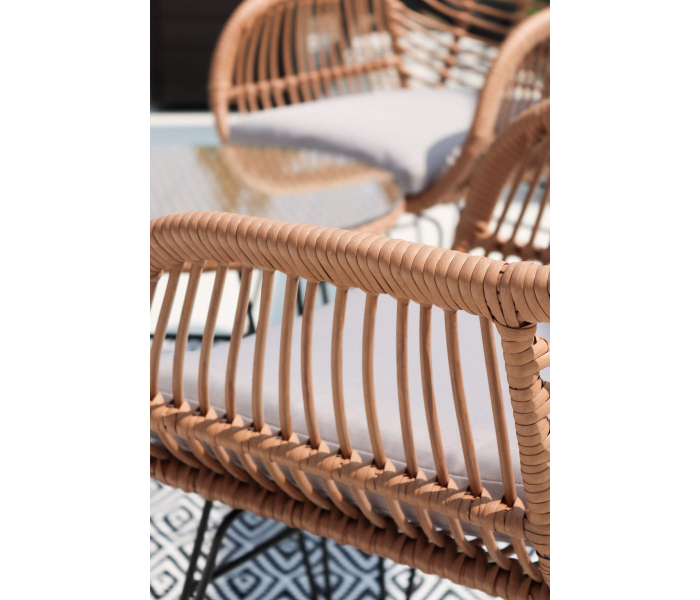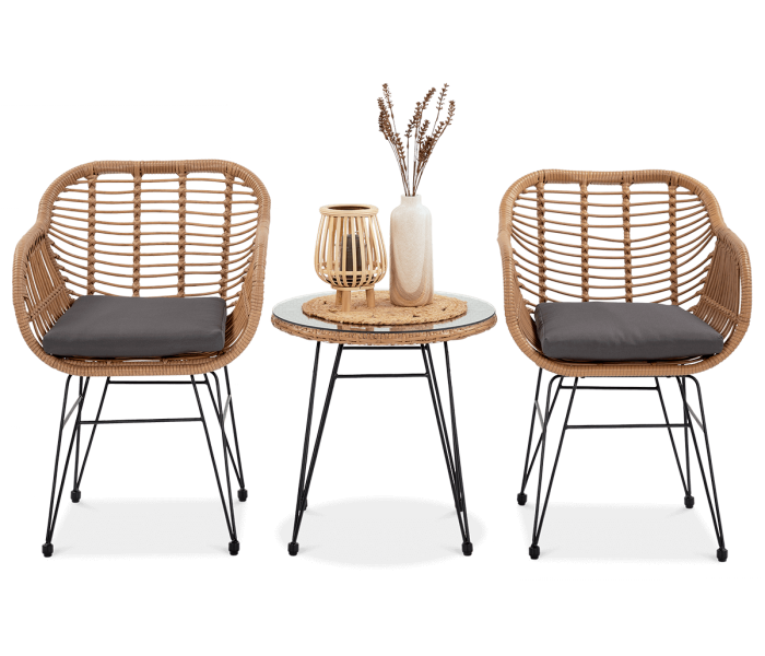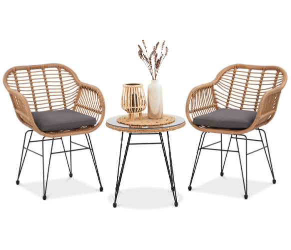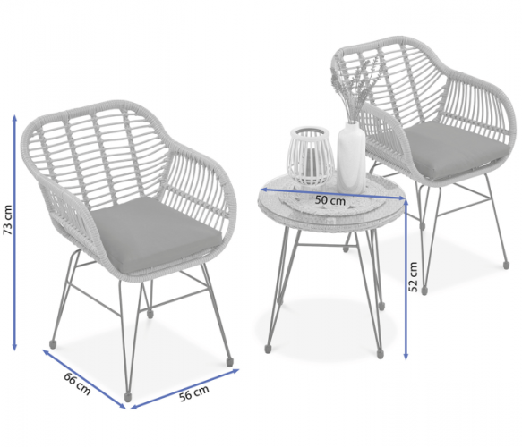 Набір меблів для тераси KUBU стіл + 2 крісла - відчуйте літні моменти, наповнені сонцем і радісними зустрічами на природі, завдяки незвичайному балконному комплекту Kubu 2+1. Це надзвичайно стильний і функціональний набір, що складається з двох елегантних стільців і чарівного круглого столика, який неповторно збагатить ваш простір. Стільці виготовлені зі сталі з порошковим покриттям виняткової міцності, а їх дизайнерський вигляд підкреслює оплетка діаметром 7 мм. Плетінка надає їм затишний і природний характер, одночасно забезпечуючи комфорт під час сидіння. Для ще більшого комфорту в комплект входять м'які подушки з поліестерової тканини модного світло-сірого відтінку товщиною 5 см. Тепер ваші моменти відпочинку на терасі або балконі будуть не тільки комфортними, але й надзвичайно стильними.Стіл, що входить в комплект, виготовлений з безбарвного загартованого скла товщиною 5 мм. Це матеріал, який гарантує не тільки неймовірну довговічність, але й стійкість до будь-яких пошкоджень. Завдяки цьому ви зможете насолоджуватися прекрасним зовнішнім виглядом і функціональністю цього столу протягом багатьох років. Комплект Kubu 2+1 створений для тих, хто хоче створити затишне та елегантне місце для відпочинку, навіть якщо у нього невеликий простір. Завдяки невеликим розмірам він ідеально підходить для балконів, терас і навіть садів. Набір ідеально поєднує в собі функціональність, стиль і довговічність, що робить його ідеальним вибором для людей, які шукають не тільки комфорт, але і красивий зовнішній вигляд. Не чекайте більше та замовляйте набір Kubu 2+1 сьогодні, щоб насолодитися унікальними моментами відпочинку на природі. Подаруйте своїй терасі чи балкону нове життя та зробіть їх оазисом спокою та насолоди. Вибирайте меблі, які не тільки викличуть інтерес, але й задовольнять ваше прагнення до краси та комфорту. Замовляйте зараз і створюйте місце своєї мрії для відпочинку на природі!