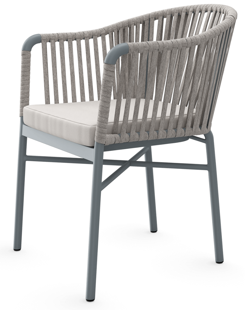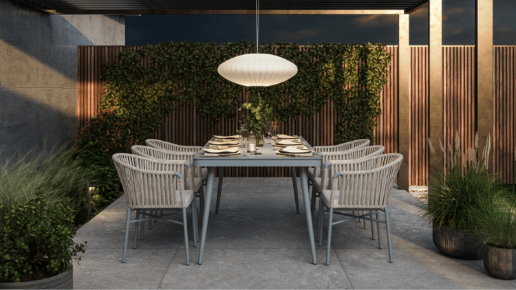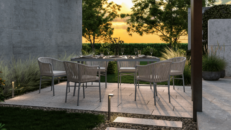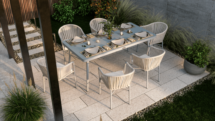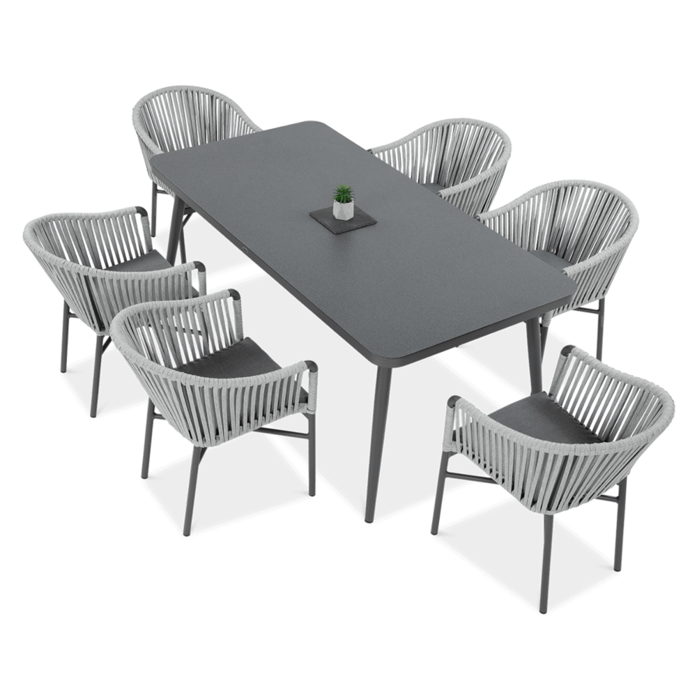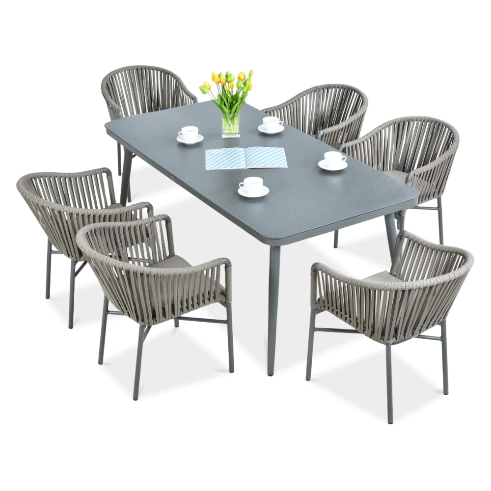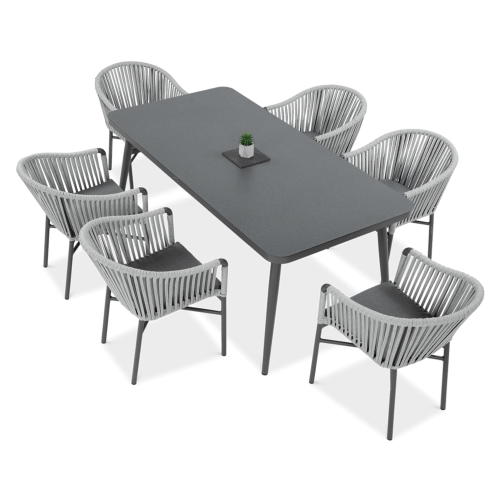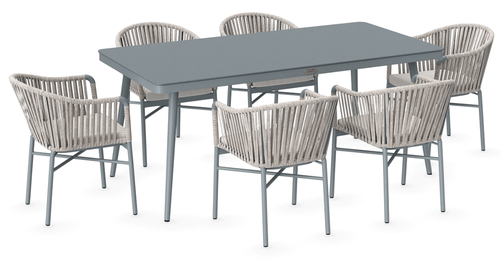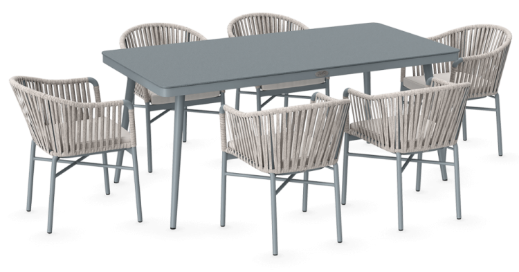 Набір садових меблів CALLAS 180 стіл +6 крісел - якими мають бути садові меблі вашої мрії? Модні, стильні, оригінальні? Комплект CALLAS 6/180 неодмінно відповідатиме цим вимогам! Це сучасний 6-місний обідній комплект з оригінальним дизайном, що ідеально відповідає останнім тенденціям в облаштуванні садового простору. Набір CALLAS 6/180 складається з 6 зручних крісел, оздоблених яскравим нейлоновим канатом з підібраними за кольором подушками на сидіннях, і розкішного столу довжиною 180 см, який доповнює міцне фарбоване скло під камінь, що ідеально підкреслює нетрадиційний стиль набору. Він підтримується міцною і легкою алюмінієвою конструкцією, яка - на додаток до належної міцності і стабільності - забезпечує додаткові естетичні якості. Використання матеріалів найвищої якості гарантує, що меблі є надзвичайно практичними та стійкими до несприятливих умов та атмосферних факторів - їх не лякає дощ або перепади температур. Завдяки стійкості до ультрафіолетових променів, набір збереже свої прекрасні кольори, бездоганний зовнішній вигляд і властивості протягом багатьох сезонів. Набір меблів для їдальні CALLAS 6/180 - це відповідь на сучасні тенденції. Він дозволить вам створити місце у вашому саду в сучасному стилі, зберігаючи при цьому максимальну функціональність. М'які подушки для сидіння, що входять до комплекту, забезпечать додатковий комфорт для відпочинку. Замовляйте вже сьогодні і декоруйте «по-своєму»!