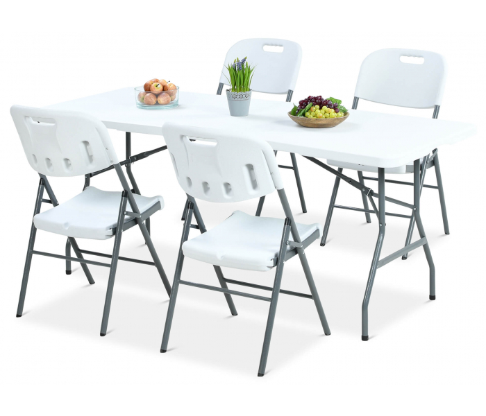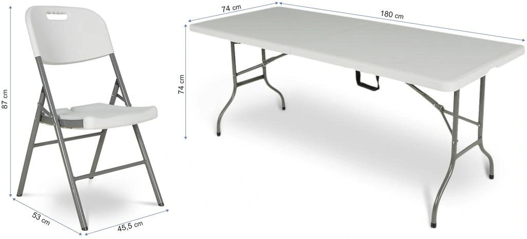 Набір садових меблів CATERINGOWY стіл + 4 крісла - ми рекомендуємо кейтеринговий набір 180/4 для всіх, хто шукає функціональний і практичний набір. Крісло і стіл повністю складаються, тому в зібраному вигляді набір займає мало місця. Використання пластику дозволило забезпечити максимальну стійкість до погодних умов. Ідеальний набір для різноманітних заходів на природі та відпочинку на природі.Зверніть увагу на якість меблів для громадського харчування, товщину стільниці та металевих профілів. Купуйте перевірені меблі для громадського харчування, які завоювали визнання споживачів у всій Польщі.