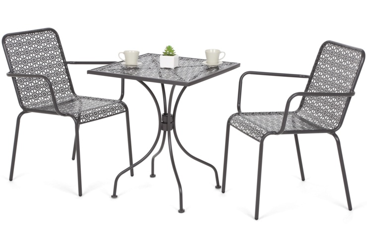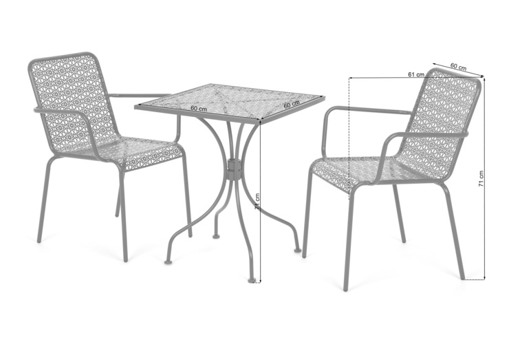 Комплект металевих меблів розрахований на двох осіб. Стіл і стільці виготовлені зі сталі з порошковим покриттям. Набір стійкий до зовнішніх факторів. Металеві садові меблі Maja Square grey 2+1 легко підтримувати в чистоті, а їх поверхня надовго залишиться неушкодженою. Ажурні меблі забезпечать вам місце для відпочинку і додатково стануть прикрасою простору.Сірі металеві меблі Maja Square 2+1 – не тільки для тераси!Сірий меблевий гарнітур з ажурного металу забезпечить вам місце для відпочинку на терасі. Такий набір підійде і на маленькому балконі. Стіл з розміром стільниці 60 × 60 см зі стільцями підійде для затишного невеликого кафе або саду перед кондитерською. На кінцях ніжок меблів використовуються пластикові заглушки, щоб захистити підлогу від подряпин. Ви також можете використовувати цей набір всередині будівлі.Металеві садові меблі Maja Square grey 2+1 виготовлені зі сталі з порошковим покриттям. Завдяки цьому вони стійкі до механічних пошкоджень, наприклад, розтріскування. Спеціальна захисна фарба робить меблі винятково стійкими до погодних умов. Стіл і стільці стійкі до дощу і сонячного світла.Металеві садові меблі Maja Square grey 2+1 покриті напівматовою фарбою. Це запобігає появі непривабливих відбитків пальців на їх поверхні. Ви можете зібрати стіл з цього набору самостійно, завдяки монтажним аксесуарам, що входять до виробу.Комплект меблів підходить для садів, оформлених у класичному та ретро стилях. Завдяки ажурному листовому металу вироби виглядають легкими, незважаючи на міцну конструкцію. Вони чудово виглядатимуть на терасі або балконі, покритому коричневою або темно-сірою композитною платформою, а також на бежевій плитці.