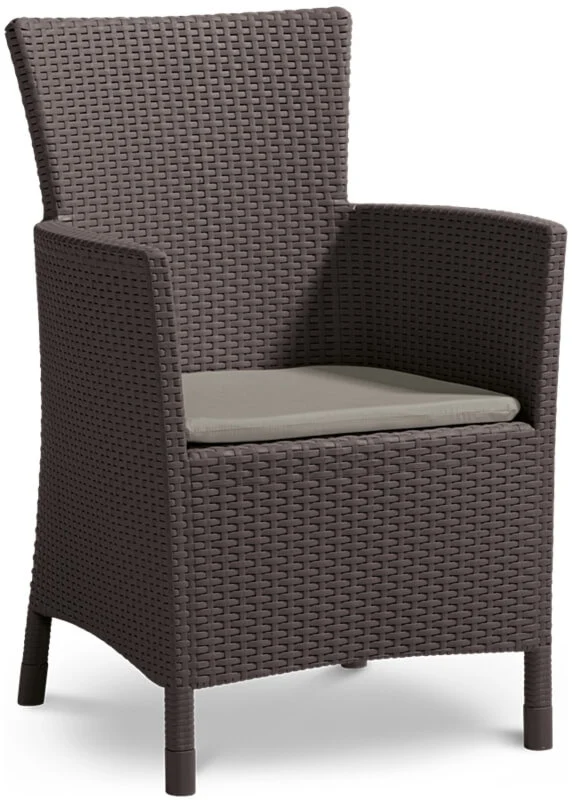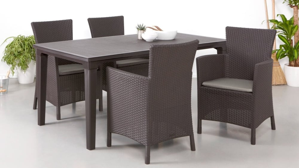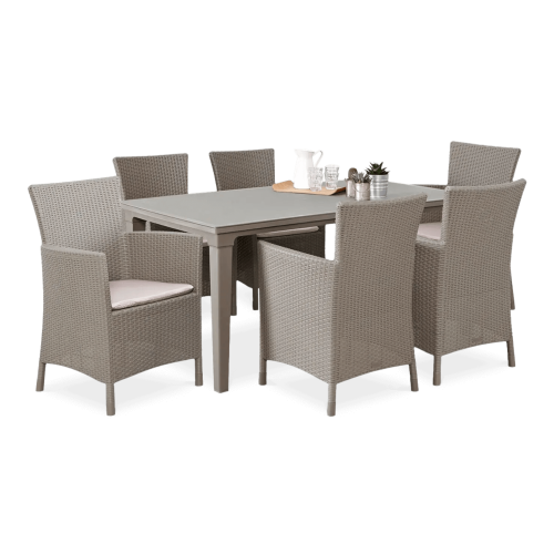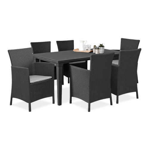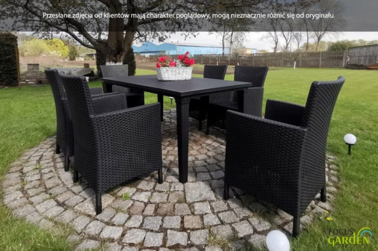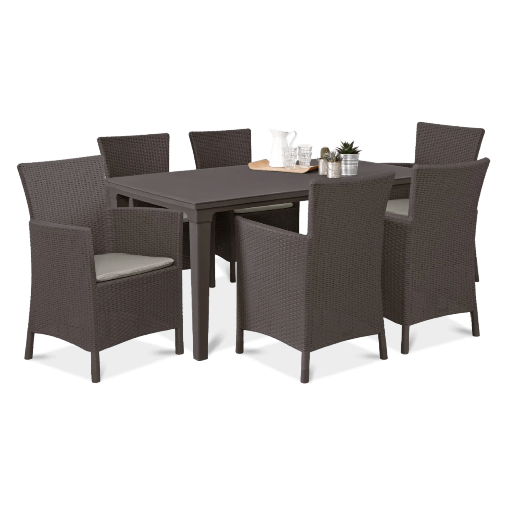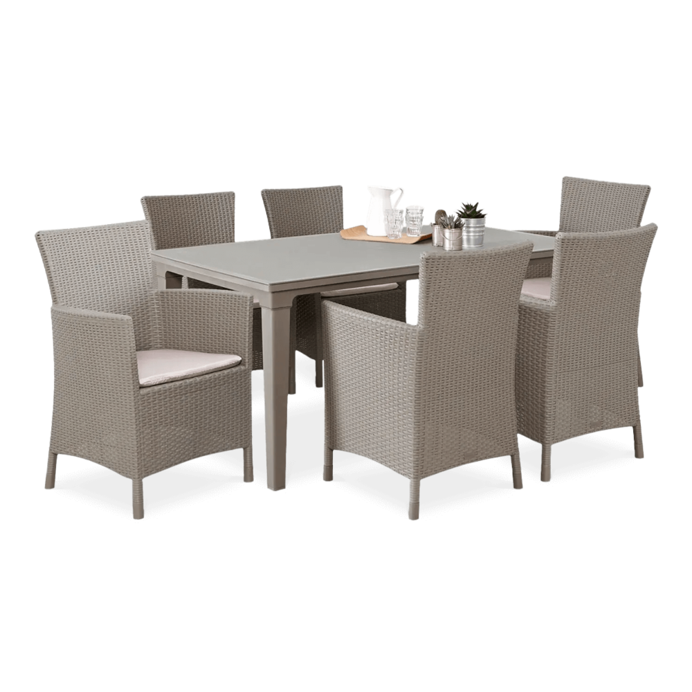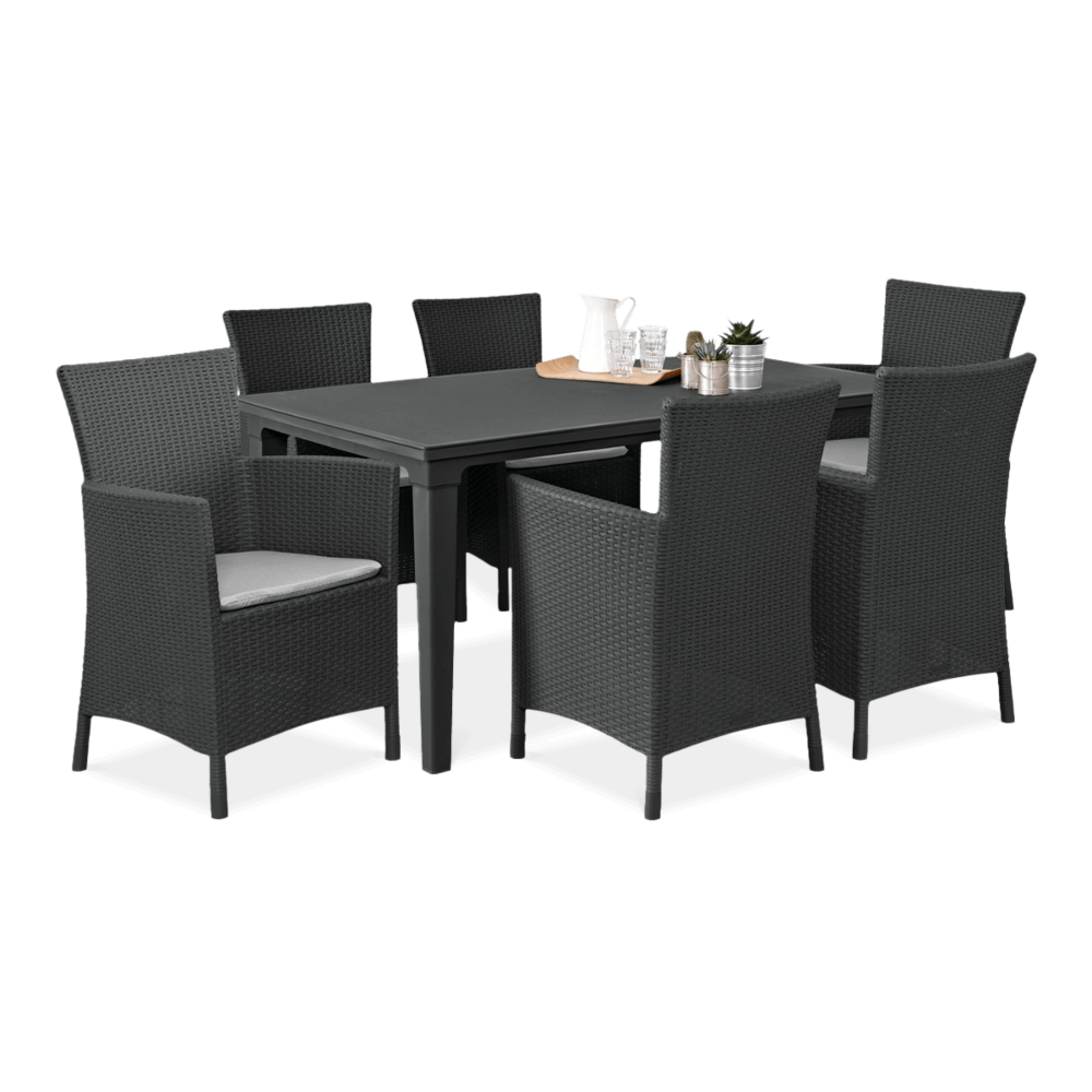 Набір садових меблів TOSCANA стіл + 6 крісел - сучасний і виключно елегантний обідній набір з високоякісного поліпропілену з декоративним візерунком з ротанга. Набір складається з 6 великих і зручних крісел і великого столу з отвором для парасольки. Якщо ви шукаєте гарний, практичний і недорогий набір для свого саду або тераси, наш набір стане відмінним вибором. Виняткова механічна міцність і стійкість до погодних умов забезпечить набору TOSCANA довгі роки.