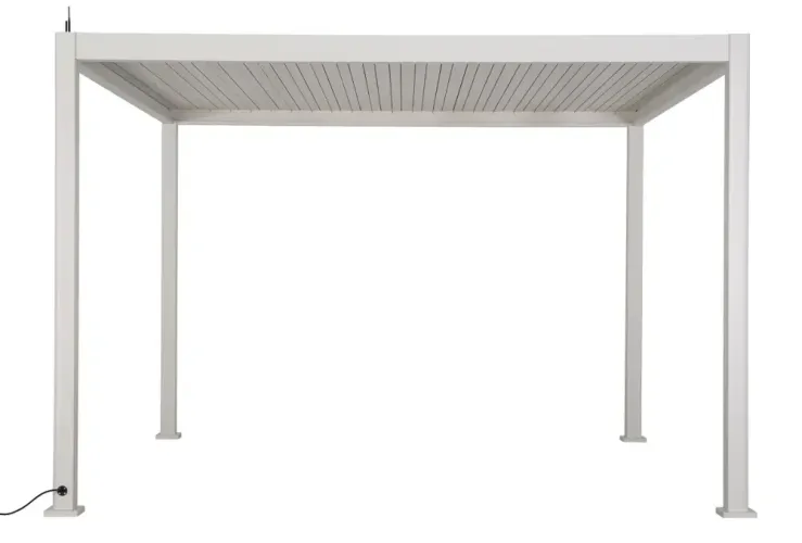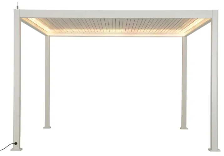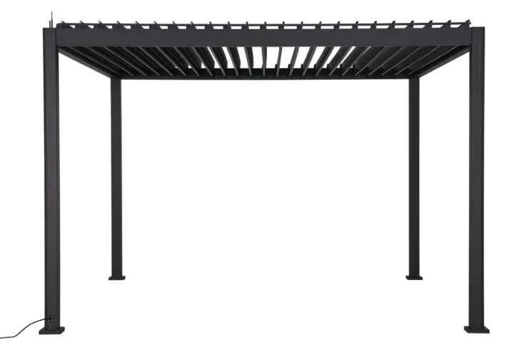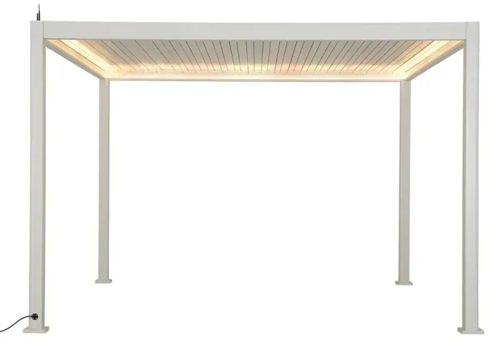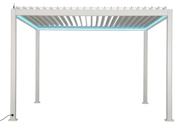 Пергола оснащена електричним дахом, який відкривається і закривається за допомогою дистанційного керування. Завдяки рухомим алюмінієвим ламелям ви можете регулювати ступінь захисту від сонячних променів і дощу відповідно до своїх уподобань. Цей тип сучасних рішень визначають як біокліматичні перголи. Вони дозволяють встановити стулки перголи під таким кутом, щоб простір перголи можна було затінювати і одночасно провітрювати. Крім того, пергола має світлодіодне освітлення, яким також можна керувати за допомогою пульта. Ви можете вмикати та вимикати освітлення, регулювати яскравість і змінювати кольори, оскільки пергола пропонує 7 різних кольорів . Пульт живиться від двох батарейок ААА, які входять в комплект. Завдяки ньому ви зможете зручно керувати жалюзі та освітленням та регулювати колір та яскравість освітлення під свій настрій. Пергола має клас вітростійкості 6/9 BFT і має клас захисту IPX5, що означає, що вона стійка до дощу та бризок. Пергола оснащена лінійним приводом з вхідною напругою 24 В постійного струму та класом захисту IP66. Блок керування також має вхідну та вихідну напругу 24 В постійного струму та захист IP65. Світлодіодна стрічка працює з вхідною напругою 24 В постійного струму, має потужність 10 Вт на метр і має клас захисту IP68. Блок живлення Pergola приймає вхідну напругу 100-240 В, має клас захисту IP67 і максимальну потужність 350 Вт. Садова пергола PLATINUM 3x4 дозволяє керувати за допомогою частоти 600-2700 МГц, а вихідна потужність радіостанції становить 10 Вт. Збірка і розвантаження вимагає участі кількох людей, використовуючи інструкцію, що входить в комплект. Його елементи мають попередньо просвердлені отвори для зручності монтажу. У комплект також входять анкери для кріплення. Щоб підтримувати вашу перголу в хорошому стані, ми рекомендуємо регулярно чистити її водою з миючим засобом і м’якою ганчіркою. У більшості випадків не потрібно буде змащувати рухомі частини перголи . Однак у разі появи скрипу рекомендуємо використовувати силіконовий мастильний спрей. При зниженні температури нижче 0°C рекомендується обмежити використання перголи, щоб продовжити термін її служби. ВАЖЛИВО: Взимку ламелі необхідно розміщувати у вертикальному (відкритому) положенні. Якщо дах закритий під час снігопаду та не перевіряється регулярно, існує ризик деформації ламелей та можливого протікання даху. Для безпечного розвантаження потрібна додаткова особа.