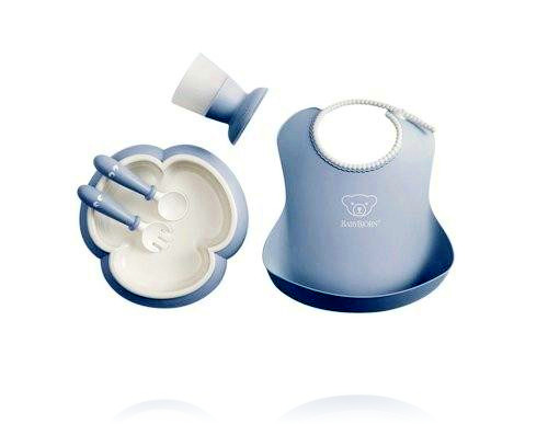 Дитячий набір посуду BabyBjorn Baby Dinner Set - набір посуду, що включає тарілку, чашку, столові прилади та слинявчик. Представлений у чотирьох кольорах. Ви можете легко вибрати як для хлопчика, так і для дівчинки. Дуже легко миються. А також це чудова ідея для подарунка, тому що набір йде у гарній подарунковій коробці. Кишеня регулюється та має додаткову кишеню, куди будуть падати залишки їжі. Тепер Ви витрачатимете менше часу для прибирання після годування дитини.