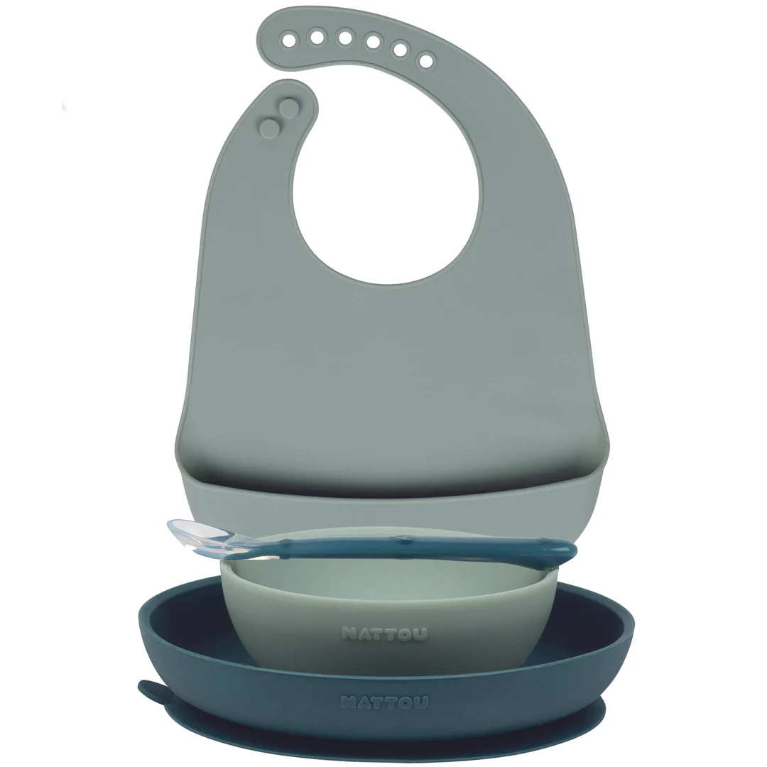 Набір силіконового посуду 4 шт з слюнявчиком NATTOU - цей чудовий набір страв для немовлят включає все необхідне, щоб полегшити їжу. Нагрудник створений для того, щоб ваш малюк був чистим і зручним, а тарілка, ложка та миска спеціально виготовлені, щоб їх було зручно тримати маленькими ручками. Дитячий набір для їжі виготовлений з м'якого силікону, безпечного для маленьких ротиків. Цей набір ідеально підходить для того, щоб навчити малюка їсти самостійно. Його також можна мити в посудомийній машині, що полегшує очищення.