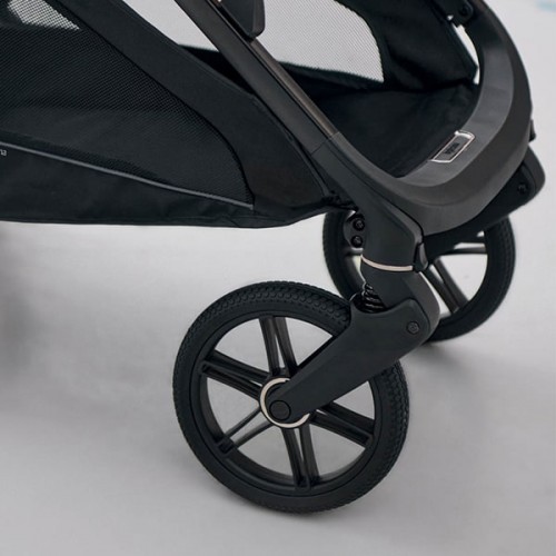 - великі амортизовані колеса із кульковими підшипниками ідеально підходять для прогулянок місцевістю з будь-яким рельєфом; передні колеса з функцією обертання та блокування становлять у діаметрі 190 мм, тоді як задні - 260 мм.