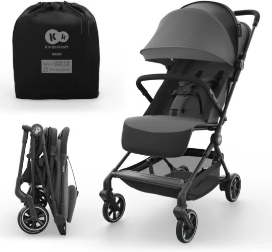 Прогулянкова коляска Kinderkraft NEBO - це коляска, яка ідеально підходить для щоденних поїздок містом, але ще більше проявляє себе під час подорожей. Це легка коляска зі швидким складанням, компактним форматом салону та зручним сидінням, яке можна розкласти в горизонтальне положення. Якщо ви шукаєте коляску для літака, для відпочинку або просто зручну міську коляску, Nebo ідеально підійде для цих завдань. Цю справді легку коляску легко переносити сходами, носити однією рукою або швидко пакувати в багажник. Ідеально підходить, якщо ви шукаєте легку коляску для міста та щоденних поїздок. Nebo була розроблена як практична коляска для літака та аеропорту – її компактний, зручний для подорожей формат дозволяє легко переміщати її. Пам’ятайте, що конкретні правила можуть відрізнятися залежно від авіакомпанії. Швидке складання однією рукою CLICK & FOLD. Цей механізм дозволяє швидко та легко складати коляску, навіть тримаючи дитину або сумку в іншій руці. У складеному вигляді коляска стоїть самостійно, що робить її неймовірно зручною як вдома, так і в дорозі.. Капюшон захищає від сонця та забезпечує додатковий захист у негоду. Він також висувається та має приховане віконце, щоб ви могли стежити за своєю дитиною, не зупиняючи коляску. Більше не потрібно турбуватися про своє взуття під час поїздок та щоденних прогулянок – колеса міцні та практичні. Амортизація допомагає впоратися з нерівностями, тому Nebo, як міська коляска, є більш стійкою та плавною. Ремень безпеки надійно тримає вашу дитину та має м’які накладки, що гарантує відсутність дискомфорту під час тривалих прогулянок. Бампер знімний, що полегшує посадку та висадку дитини.