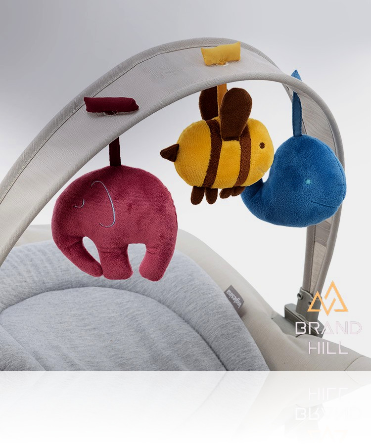 - 3 м'які іграшки, представлені на ігровій панелі, мають різні тактильні характеристики і видають різні звуки, стимулюючи психофізичний розвиток малюка