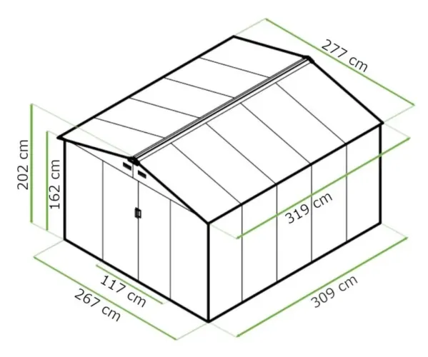 Садовий будинок Hardmaister для інструментів HUDSON 277x319 см - ідеально підходить для садового обладнання та інструментів. Виготовлений з оцинкованої сталі , він надзвичайно міцний та стійкий до корозії, що забезпечує надійне використання за будь-яких погодних умов. Подвійні розсувні двері забезпечують легкий доступ до внутрішньої частини, а можливість замикання їх навісним замком підвищує безпеку. Чотири вентиляційні отвори ефективно зменшують вологу, захищаючи вміст від цвілі та іржі. Практичне вікно пропускає природне світло в сарай. Сучасний інструментальний сарай HUDSON від Hardmaister – ідеальне рішення для тих, хто цінує естетику та довговічність. Вікно пропускає природне світло, підвищуючи комфорт. Вертикальні пазові панелі надають конструкції класичного вигляду . Детальні інструкції роблять складання швидким та простим . Сарай не потребує фарбування чи обслуговування, а його встановлення не потребує дозволу на будівництво.