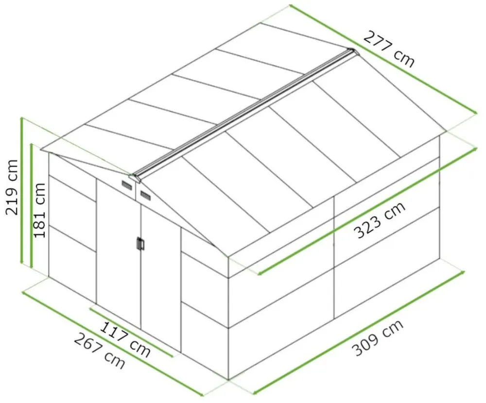 Садовий будинок Hardmaister для інструментів MONTREAL 277x323 см - це елегантне та довговічне рішення для любителів садівництва. Розміром 277 x 323 см він пропонує достатньо місця для зберігання садового інвентарю та обладнання . Його конструкція з оцинкованої сталі товщиною 0,25 мм забезпечує стійкість до погодних умов та ультрафіолетового випромінювання. Легке обслуговування водою підтримує сарай у відмінному стані. Двосхилий дах відводить воду та сніг, запобігаючи утворенню ставків.Котедж MONTREAL оснащений розсувними дверима, що забезпечують легкий доступ навіть у обмеженому просторі. Їхня функціональність ідеально відповідає потребам користувачів з невеликими садами та вузькими проходами.Сталеві кутові кронштейни в будинку MONTREAL підсилюють конструкцію, забезпечуючи більшу стійкість та стійкість до навантажень. Їхня поверхня покрита антикорозійним покриттям , яке ефективно захищає їх від іржі в суворих умовах.