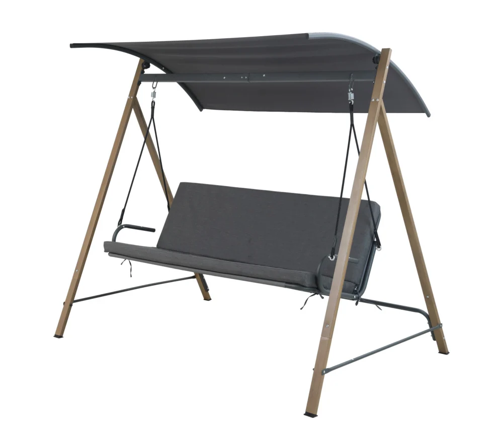 Садова гойдалка COMO Dark Grey - шукаєте ідеальну садову гойдалку? Зверніть увагу на нашу останню новинку - гойдалку Como. Її сталевий каркас з порошковим покриттям гарантує міцну конструкцію, яка витримає вимоги будь-якого саду. Трансферний принт з дерев'яною обробкою надає гойдалці неповторного, затишного вигляду. Лицьова сторона подушки сидіння виготовлена з олефіну, який не тільки забезпечує м'якість, але й довговічний та простий у догляді. Зворотний бік - поліестер товщиною 7 см. Безсумнівною родзинкою гойдалки є красивий навіс з міцного поліестеру, який захищає від сонця і дрібних опадів. Захист і комфорт тут йдуть рука об руку! З гойдалкою Como ви відкриєте для себе новий вимір відпочинку в саду. Нехай кожен день стане можливістю для хвилини релаксу на свіжому повітрі, а наша гойдалка стане вашим улюбленим місцем, де ви зможете відпочити і насолодитися красою навколишньої природи.