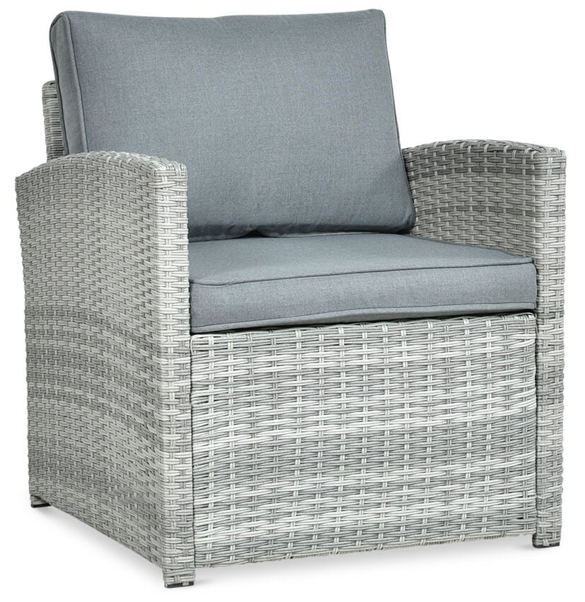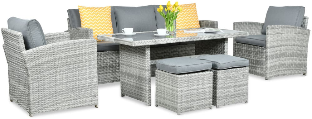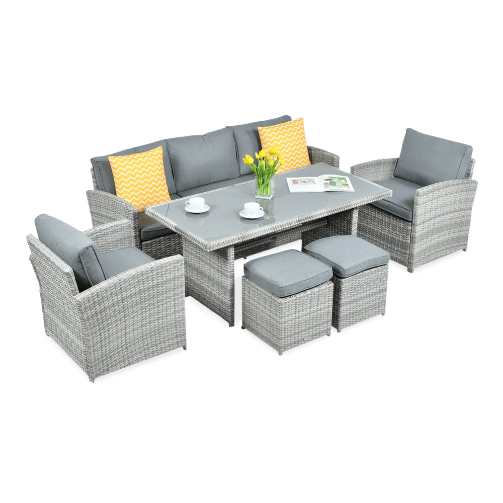 Комплект садових меблів BORNEO - з техноротанга розрахований на максимальний комфорт для 7 осіб. У набір пуфів Borneo + Stone Grey входять 3-місний диван, 2 крісла, 2 пуфа і великий практичний стіл зі скляною стільницею. Меблі характеризуються модним стилем і універсальністю, що випливає з їх конструкції і властивостей матеріалів. Набір Borneo виготовлений з міцної та міцної сталі, обтягнутий техноротангом сірого кольору. Пропоновані садові меблі прослужать вам тривалий час, у різних випадках, без необхідності обслуговування. Устаткування з комплекту техноротангу Borneo підходить як для внутрішнього, так і для зовнішнього використання. Техноротанг залишається стійким до будь-яких погодних примх, зберігаючи зовнішній вигляд, ідентичний натуральному лозі. У стандартну комплектацію входять великі, легко регульовані подушки. Вони забезпечать вашим гостям відчутний комфорт, а кольори наволочок на блискавці ідеально гармонують з кольором меблів. Диван Борнео з техноротанга + пуфи Stone Grey дуже простий і легкий у догляді. Перенесення дивана, крісел, пуфів і столу в інше місце не складе труднощів - техніка відносно легка і міцна. Висока якість виготовлення робить ці садові меблі чудовим вибором для домашнього та професійного використання.