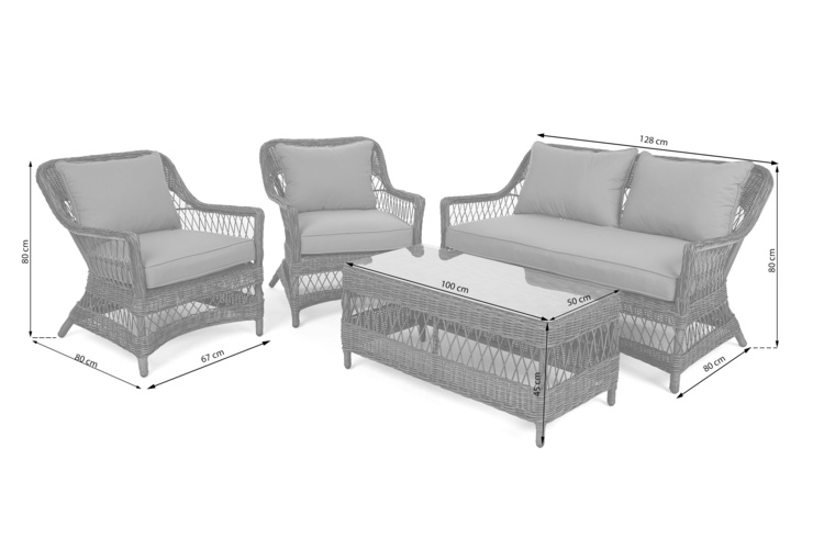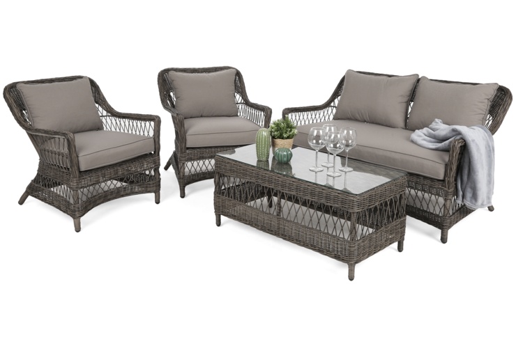 Комплект складається з двох крісел і дивана, який забезпечить комфортне розміщення до чотирьох осіб. Садові меблі з техноратангу Puglia grey можна розмістити на терасі або знайти для неї місце в альтанці подалі від будинку. Стіл розміром 50 × 100 × 45 см забезпечує оптимальне місце для закусок і напоїв для кількох людей. Стільниця має загартоване скло товщиною 5 мм. Це гарантує стійкість келихів на столі та полегшує утримання меблів у чистоті.Садові меблі з техноратангу Puglia grey виготовлені з матеріалів, стійких до зовнішніх факторів. Алюмінієва конструкція з порошковим покриттям захищає від іржі. Масивні меблі також стійкі до механічних пошкоджень. Покриття з техноратангу збереже свій інтенсивний колір, незважаючи на часті контакти з сонячними променями. Також матеріал стійкий до дощу.Садові меблі з техноратангу Puglia grey відрізняються цікавою формою. М'яко закруглені лінії поєднуються з цікавим відтінком коричневих і сірих подушок, завдяки чому комплект буде добре виглядати в різноманітних композиціях. Ви можете розмістити його на терасі, оформленій у теплих тонах, у класичному стилі. Він також буде добре працювати в сучасному декорі в поєднанні з сірими елементами. Добре буде поєднуватися з композитним майданчиком або плиткою світлого відтінку, наприклад бежевого.