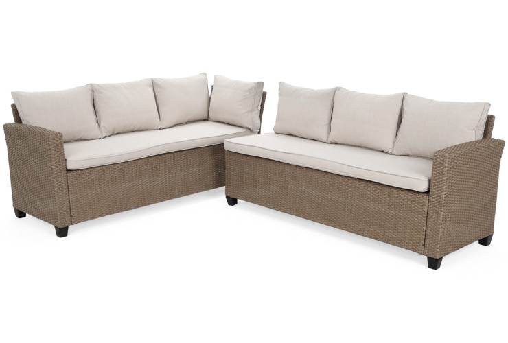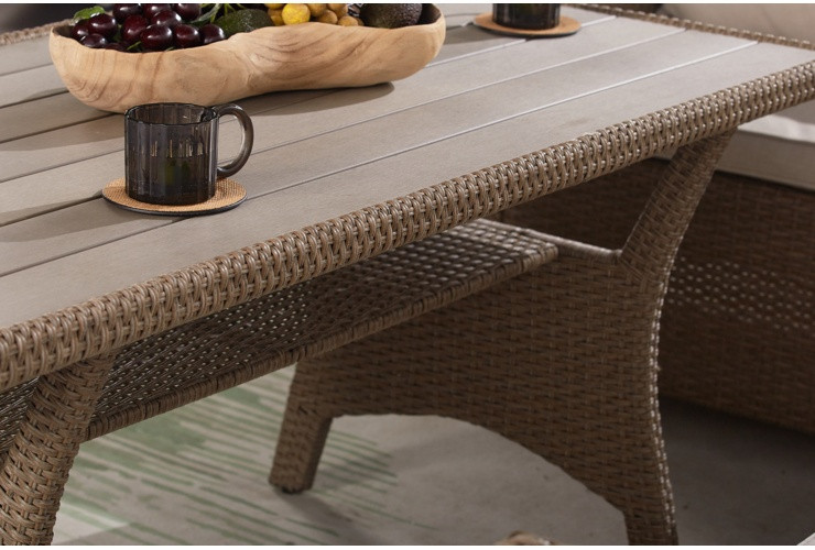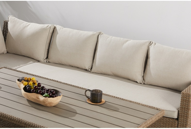 Садові меблі з техноротангу Lagos - чудовий вибір для тих, хто шукає довговічні, зручні та прості в догляді рішення, але водночас не бажає йти на компроміс з естетикою. Техноротанг чудово імітує традиційний ротанг, але, на відміну від натурального аналога, йому не страшні будь-які погодні умови. Матеріал легкий, має високу стійкість до вологи та вицвітання під дією ультрафіолету, а догляд за ним обмежується періодичним протиранням вологою ганчіркою.Садовий куточок Lagos з техноротангу додасть шарму вашому саду, терасі або внутрішньому дворику. На просторих сидіннях легко розмістяться шестеро людей, а комфортний відпочинок забезпечать м'які та елегантні подушки. Незважаючи на значні розміри, і стіл, і окремі сегменти кутового дивану дуже легкі. Комплект складається з двох сегментів кутового дивану, правого вагою 17,1 кг та лівого 19,4 кг, столика вагою 18,5 кг та подушок. Загальна вага без упаковки становить 55 кг.