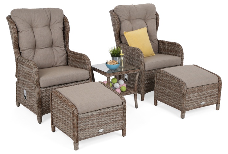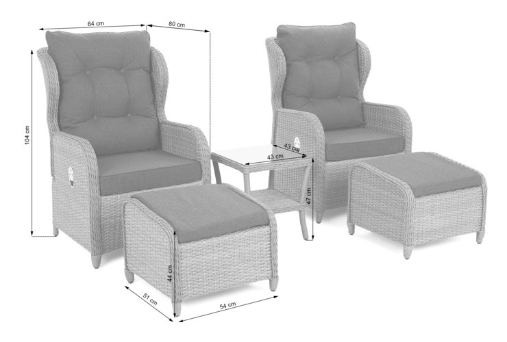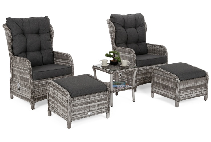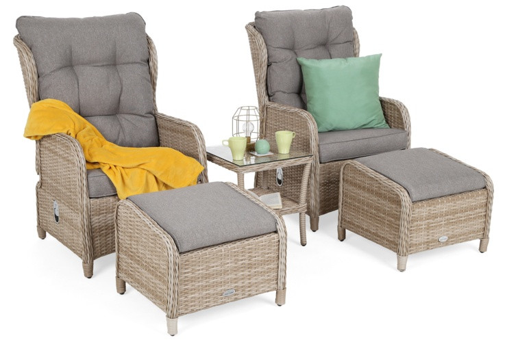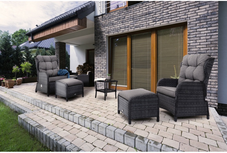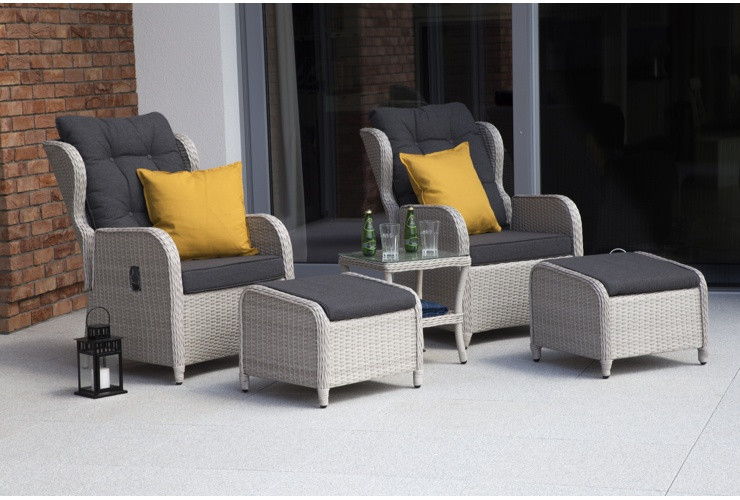 Відпочити в саду вдвох? Елегантний, компактний комплект садових меблів Sofia подбає про відпочинок вашої мрії. Це пропозиція для двох людей, які цінують максимальний комфорт і найкращий стиль.Комплект складається з двох зручних, надзвичайно містких крісел з регульованим нахилом спинки, двох підніжок (пуфів) і невеликого, але дуже функціонального столика. Меблі пропонують все необхідне для повноцінного відпочинку на терасі! Все це доповнюється приємними м’якими подушками на кріслах і підніжках.Набір садових меблів Sofia виготовлений з техноротангу та алюмінію з порошковим покриттям. Це гарантує довговічність меблів, їх стійкість і високу стійкість як до механічних пошкоджень, так і до погодних умов. Вибираючи комплект меблів з техноротангу Sofia, ви отримуєте рішення, яке прослужить вам у відмінному стані довгі роки! У свою чергу, дизайн меблів робить гарнітур стильною прикрасою для тераси. Ваш відпочинок стане ще приємнішим!